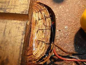 II - диаметр 1мм по меди. I - диаметр 0,27 по меди. Намотка первички - просто 2 секции, никакого выравнивания сопротивлений постоянному току. Соединены так, что конец верхней обмотки и начало нижней образуют СТ. Нижняя и верхняя половинки вторички соединены последовательно и включены в параллель со средней секцией вторички. Катушка не имеет пропитки, но крайние витки секций закреплены клеем. Полагаю, что после намотки торцы катушки промазывали каким-то жидким клеем, чтобы он немножко затек внутрь. Вся изоляция - бумага. Межслойная - тонкая типа конденсаторной, межобмоточная - 2 витка обычной трансформаторной бумаги. Катушка зафиксирована на керне картонными клиньями, транс после сборки промазан лаком от души. Именно промазан - не пропитан в вакуум-посту, это видно.