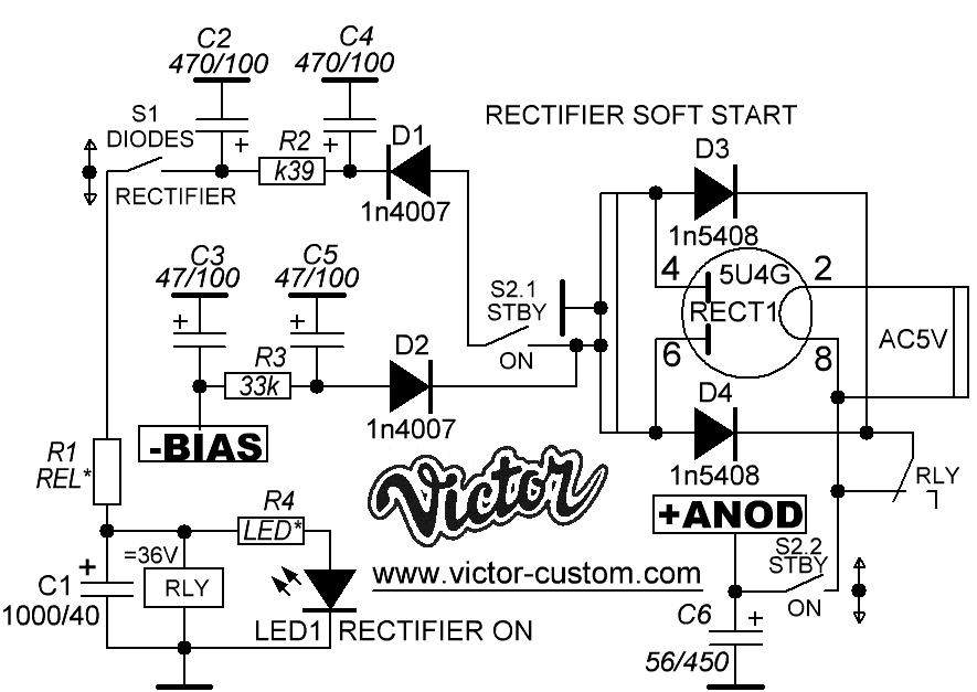 При этом напряжение на реле задается величиной резистора R1, а время его включения – величиной емкости конденсатора С1. По мере заряда конденсатора С1 напряжение на нем повышается и достигнув величины напряжения срабатывания реле RLY срабатывает и размыкает свои нормально замкнутые контакты, исключив таким образом диоды D3 и D4 из схемы заряда конденсатора анодного питания С6. Теперь конденсатор С6 заряжается от кенотрона RECT1 которому нужно только поддерживать напряжение на уже заряженном конденсаторе С6, а не заряжать его с нуля.