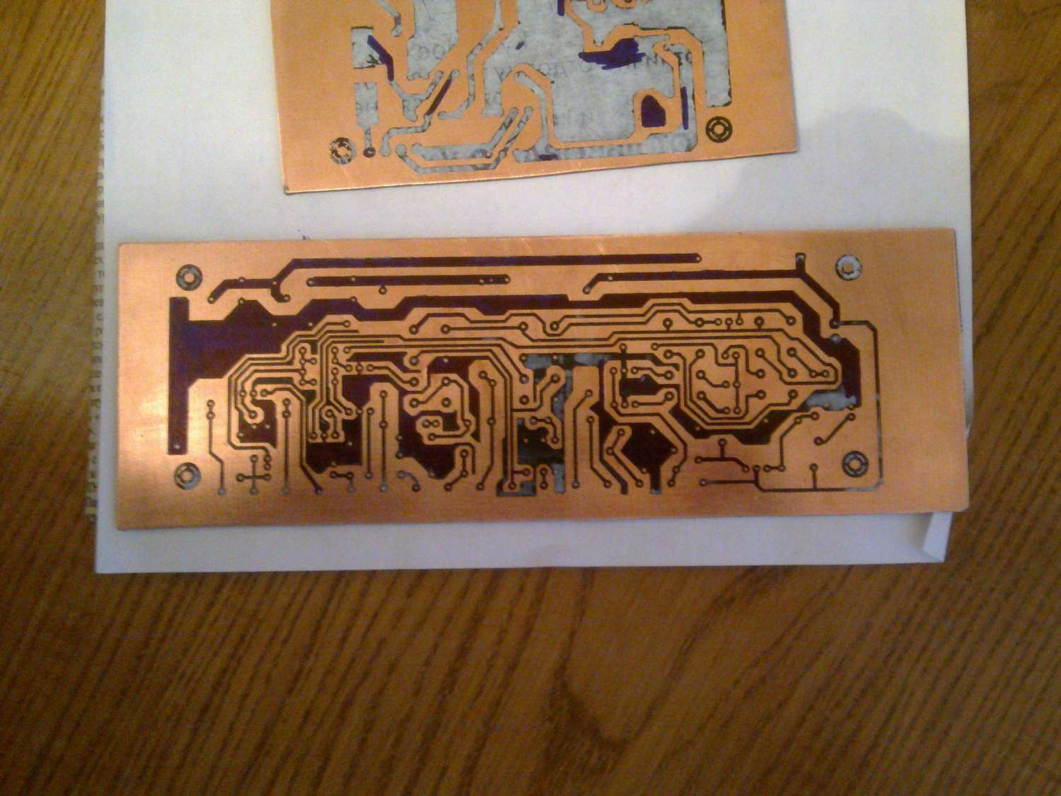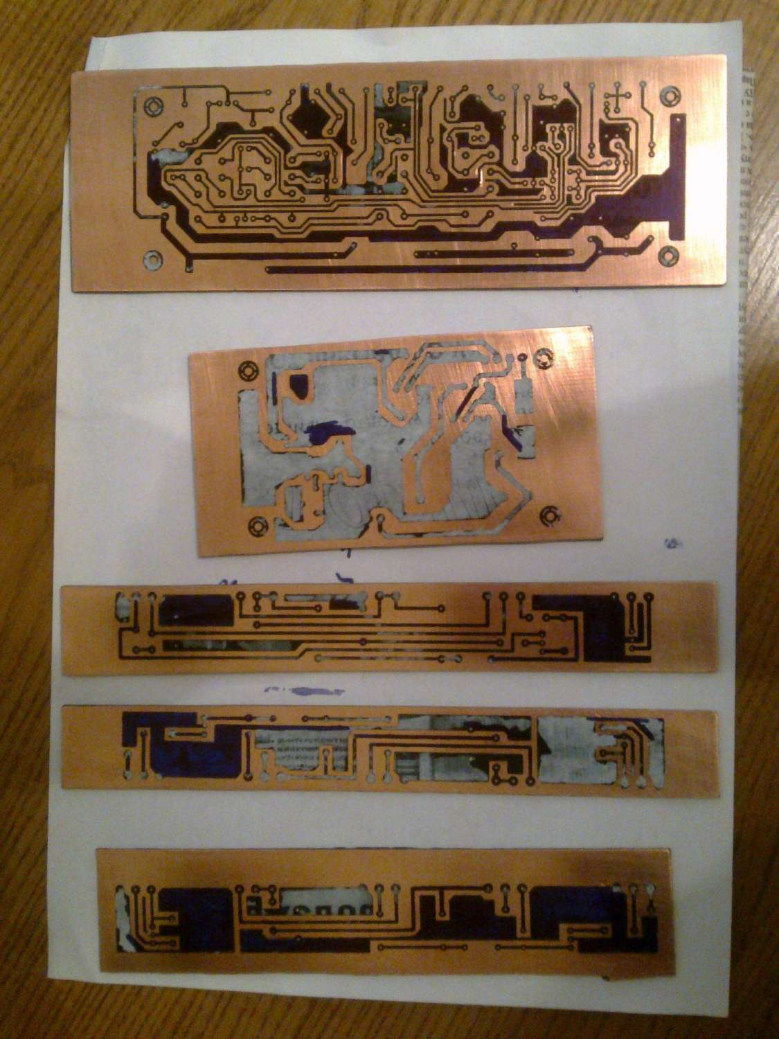 Вот пару фоток плат. Сначала думал делать все платы методом аэрозольного фоторезиста . Купил балончик Positive 20 ( дорогое удовольствие- 120 грн). Метод оказался очень капризным и в нём очень много нюансов, в основном основанные на химических реакциях , нужно строго выдерживать временные рамки из-за которых платы не всегда получаются. Не буду углубляться в тонкости процесса, скажу лишь что делал всё по технологии . Но в итоге методом фоторезиста получилась только одна плата ( коммутации - петля +кабсим) . На остальных платах почему-то на этапе проявки в растворе Крота вместе с засвеченным фоторезистом сразу начали смываться и дорожки. Вроде и раствор сделал слабый , но очень трудно найти ту грань, когда надо вовремя вытянуть плату из Крота, и быстренько смыть, а то реакция продолжается мгновенно. Вобщем, в итоге остальные платы сделал старым и проверенным ЛУТом . Всё вышло с первого раза, немного пришлось дорисовать дорожки маркером ( около 3 % ) , но зато потрачено меньше нервов и результат намного прогнозируемее , чем при фоторезисте. Кстати, сейчас уже платы почти все вытравились.