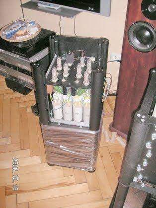 Игорь. Экстремал в звуке. Но за что я его люблю, так это за философию построения звука. Он может ответить на любой вопрос по построению своих систем, и с его ответом ты вынужден согласиться. Источник сигнала - CD проигрыватель Вега 122, вусмерть переделанный, с транспортом C.E.C., с ламповым выходом на прямонакальном 6П23П в триодном режиме. Выход до 4 В, так что преда нет, напрямую на этот монстр-усилитель. Он сам состоит из двух (неразъемных, т.к. спаяны проводами) блоков: БП и усилка. БП