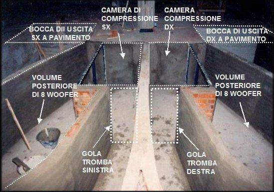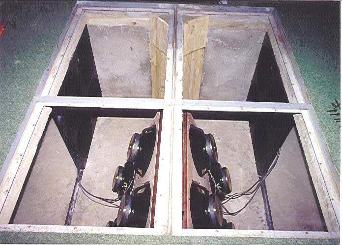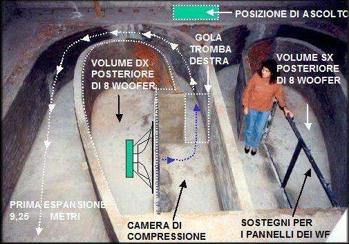 От ГМ70 отодран цоколь, и провода подпаяны прямо к выводам (для надежности и лучшего охлаждения). Трансформато выходной, заключенный в корпус, просыпанный песком и залитый маслом. По заявлению автора, вес этой конструкции 150 кг. Колонки самодельные, трехблочные, без фильтров, кроме конденсатора по ВЧ. Головки: ВЧ, СЧ на 4ГД36 и НЧ на 2-х 8ГД1 навстречу. СЧ колонка стоит на басовике, представляющим собой тумбу высотой 110 см.