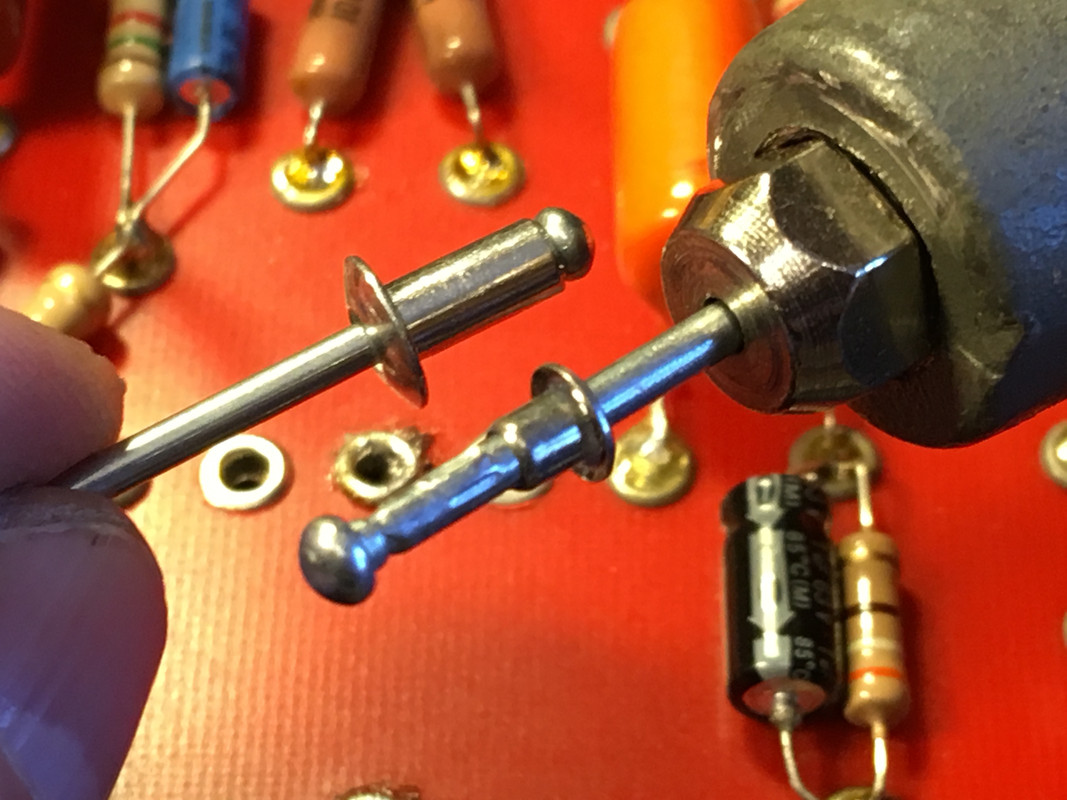 В ходе модификации усилителя возникла необходимость добавить на существующую плату несколько дополнительных айлетов. Вроде-бы элементарная процедура, но как их расклепать на месте, не снимая плату?