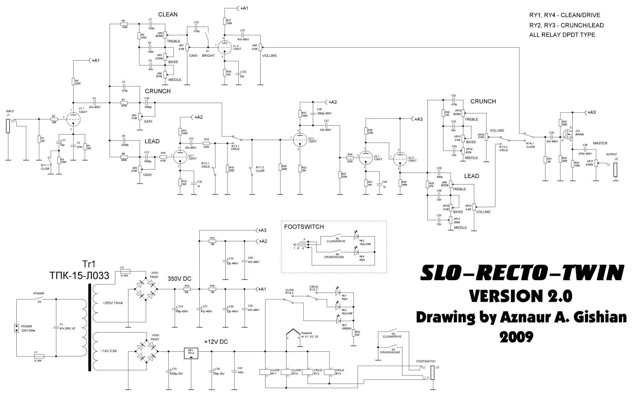 Всем привет! Прошу помощи в достаточно нехитром деле: имеется двухканальный преамп, где чистый канал - это Ерасов Блэк спейс (не спрашивайте почему), а грязный канал - Медвед Мод-С. Необходимо эти два канала подружить. Сначала я делал коммутацию на двух реле, одно из которых сажало на землю вход одного из каналов, а другое - переключало аналогичным образом выходы.