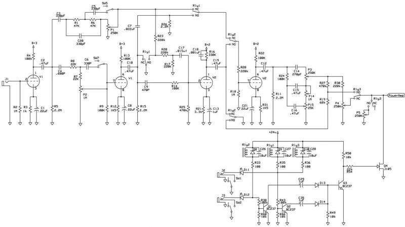 Да сижу копаю, мля. Гнездо MONO OUT. Схемно выполнено с полевика, похоже. j117- пара штук,средние ножки соединены, с другого идет на instrumental out. Так вот ни на одной ножке полевиков нет ни единого напряжения. Стоит мощный стабилизатор, похоже. С него через сопротивление должно что то поступать, но не поступает. Рядом с полевиками просто транзистор, с базы прокинут провод на коммутационную панель выключателей. С завода или самопалом- непонятно...Тупо глупо соединяю моно аут с одной из ножкой патчкорда, что через кондер и сопротивление со второй лампы, что идет на панель регуляторов- все прёт. и через моно аут и через стерео и через уши. Мощно, плотно, все ручками регулируется.