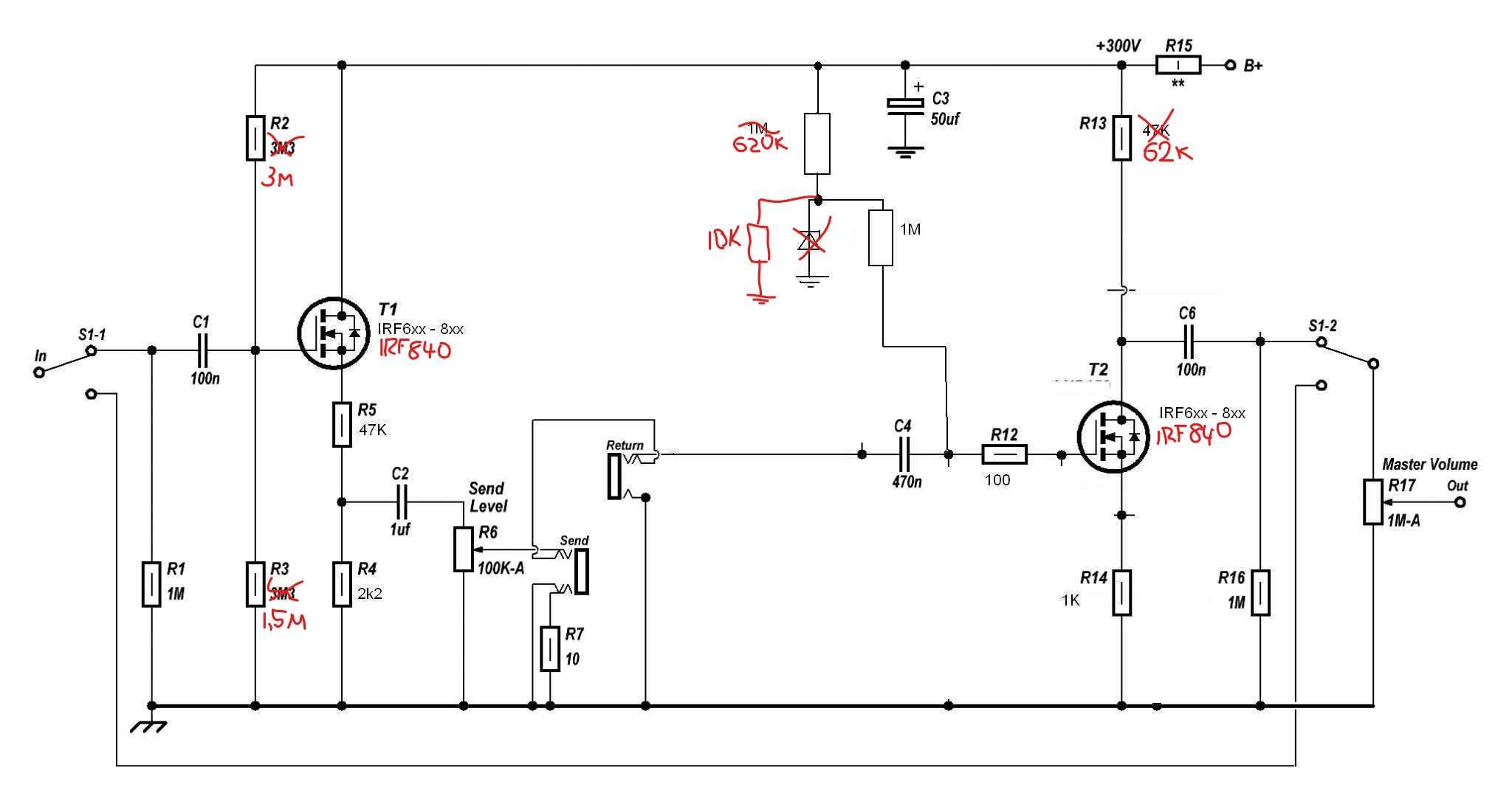 Кстати, переделал еще немного свою петлю на IRF840, довел до ума. Есть небольшой подкрас, который проявляется в едва заметном срезе высоких, но он заметен больше на малых уровнях громкости, и это можно даже считать не багом, а фичей, ибо на уровне домашней громкости высокие и так вылезают, а так получается небольшая "тонкомпенсация". Убрал из цепи смещения транзистора ретурна стабилитрон, заменив его резистором на 10 кОм, который в паре с резистором на 620 кОм образует делитель, формирующий напряжение смещения в 2,25 вольта на затворе транзистора. Так же заменил резистор на стоке, повысив его сопротивление до 62 кОм, при этом еще немного снизился ток покоя через транзистор, который сейчас составляет примерно 1 мА. Схема сейчас выглядит вот так: