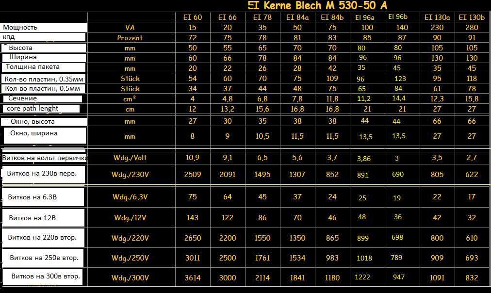 Тут я нашел таблицу, для тех, кому лень считать силовые трансы.