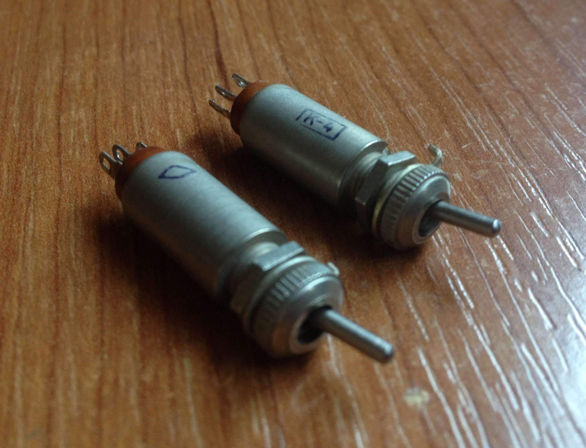 Нашел сегодня на барахолке класнючие тумблерки. Очень приятный и чёткий щелчок. Довольно миниатюрные, хоть и советские. На фото для понимания масштаба рядом лежит обычный совковый микротумблер. Интересно, где такие применялись?