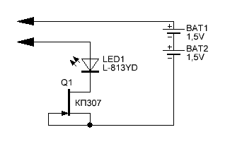 К сожалению, у меня маленький опыт работы с полевыми транзисторами. Надо сделать прозвонку. Батарея и лампочка - прожорливо, светодиод и балластный резистор - как-то по радиолюбительски. Смастерил приспособу для подбора ПТ по начальному току стока для выбора оптимального тока стабилизации. Собственно, это и схема прозвонки, только ПТ ставится в панельку: