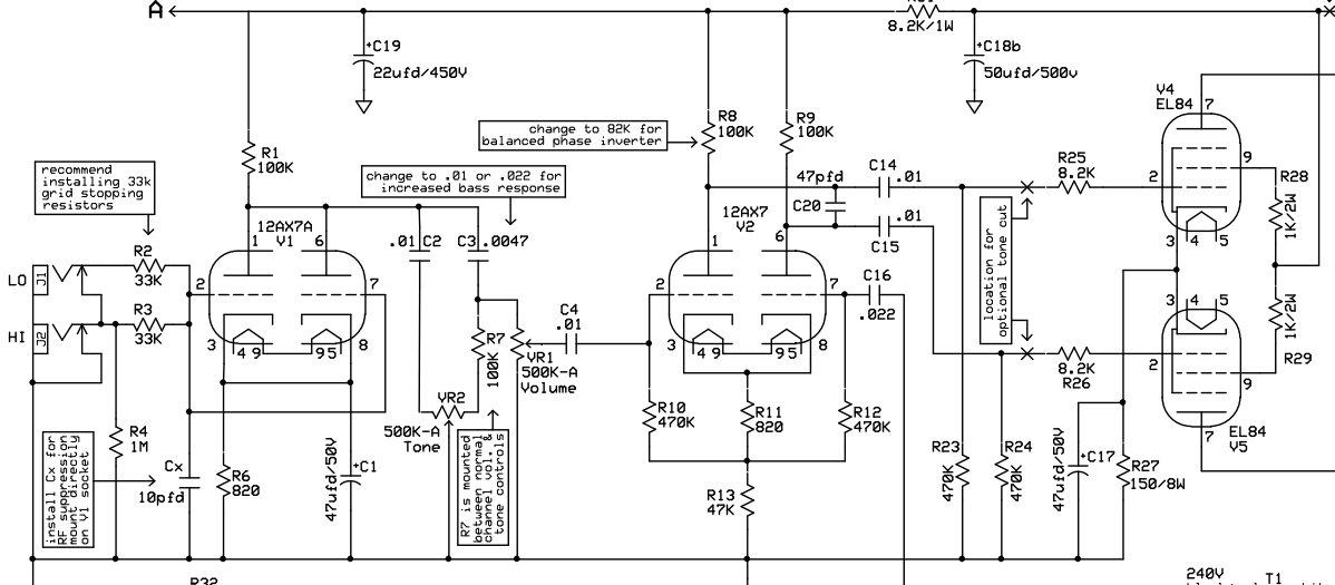 AZG, вопросы есть по вашей схеме:1. какой мощности резисторы в катодах и анодах должны быть?2. питание собираю по схеме наподобие JCM800 - если нет дросселя, на какое сопротивление примерно резистор ставить?3. можно ли вместо трехполосного регулятора тембра запилить одну ручку тона? Как на этих схемах: