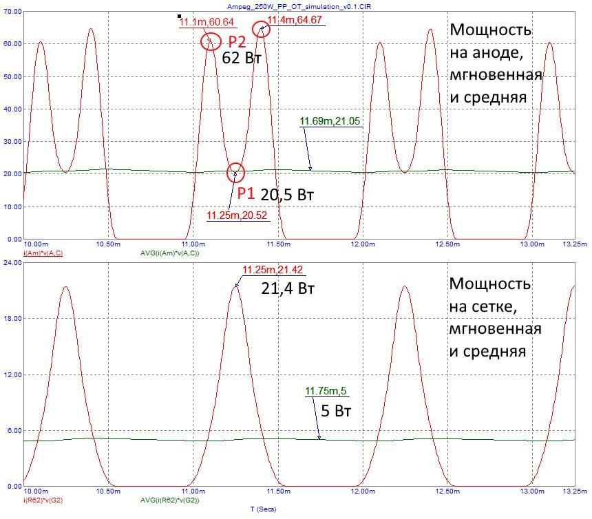 Здесь подробно мощности на аноде и сетке, точки 1 и 2 с мгновенной мощностью соответствуют точкам далее на нагрузочной прямой класса В. Интересны верблюжьи горбы на мгновенной мощности. В точке 2 имеется максимальное приближение нагрузочной прямой к кривой ограничения по 2*Pamax, где Ра=62.4 Вт. Далее следует точка 1 впадина между горбами, это состояние насыщения, где ток анода максимален, а напряжение минимально и Pa=20 Вт. Как раз в этой области происходит ограничение сигнала и видно, что запас есть и приличный. Потом возврат к точке 2 и далее к точке Bias. Верткальные разделители на осциллограммах проходят через области Bias.
