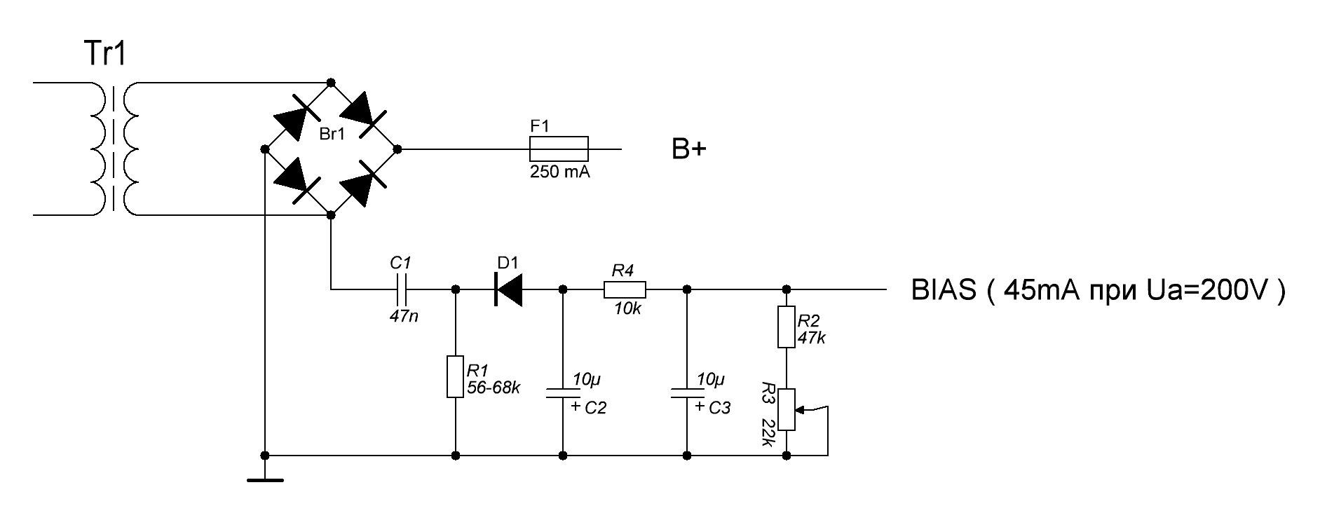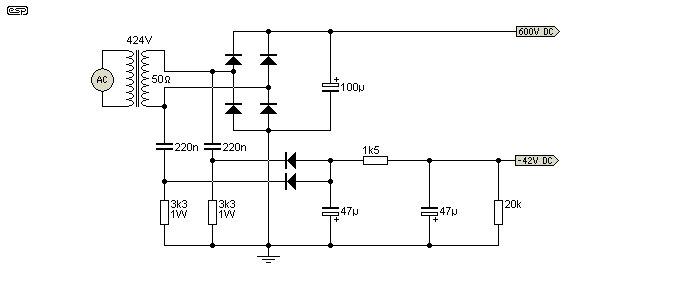 Видимо, потому как этот мой мощник с низковольтной анодкой (~110В перед мостом ), то максимальное напряжение, которое выдает данная схемка порядка 6В. Для маломощных и некоторых "среднемощных" пентодиков все ок, но хочется потестить 6п41с