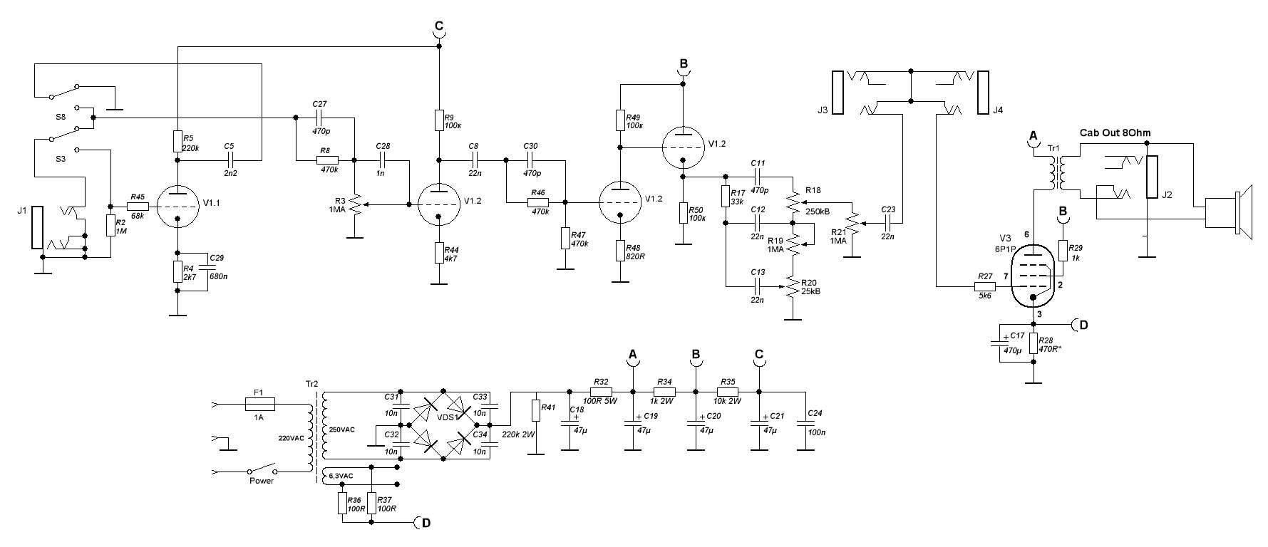 Напряжения думаю маловаты, после моста 280, вместо 100ом дроссель 5H, точка А-250в, В-239в, C-230в. На аноде относительно земли 212в. Сетку не успел замерить, как на катоде напряжение увидел выключил нафиг.