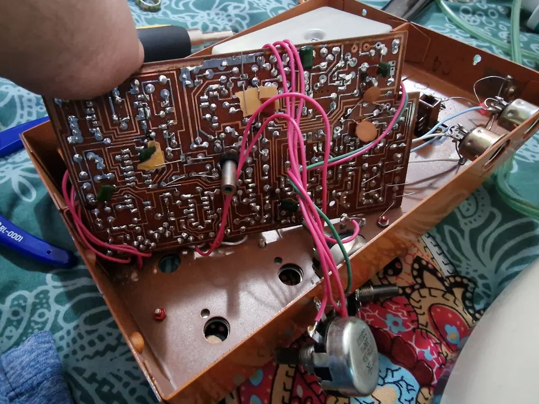 Имеется педалина электроника пэ-05. Когда приехала, то при включени в сеть и подключении переходника с din 5 на jack в усилитель стоит гул от трансформатора небольшой. Светодиод сети очень тускло горит, еле видно.