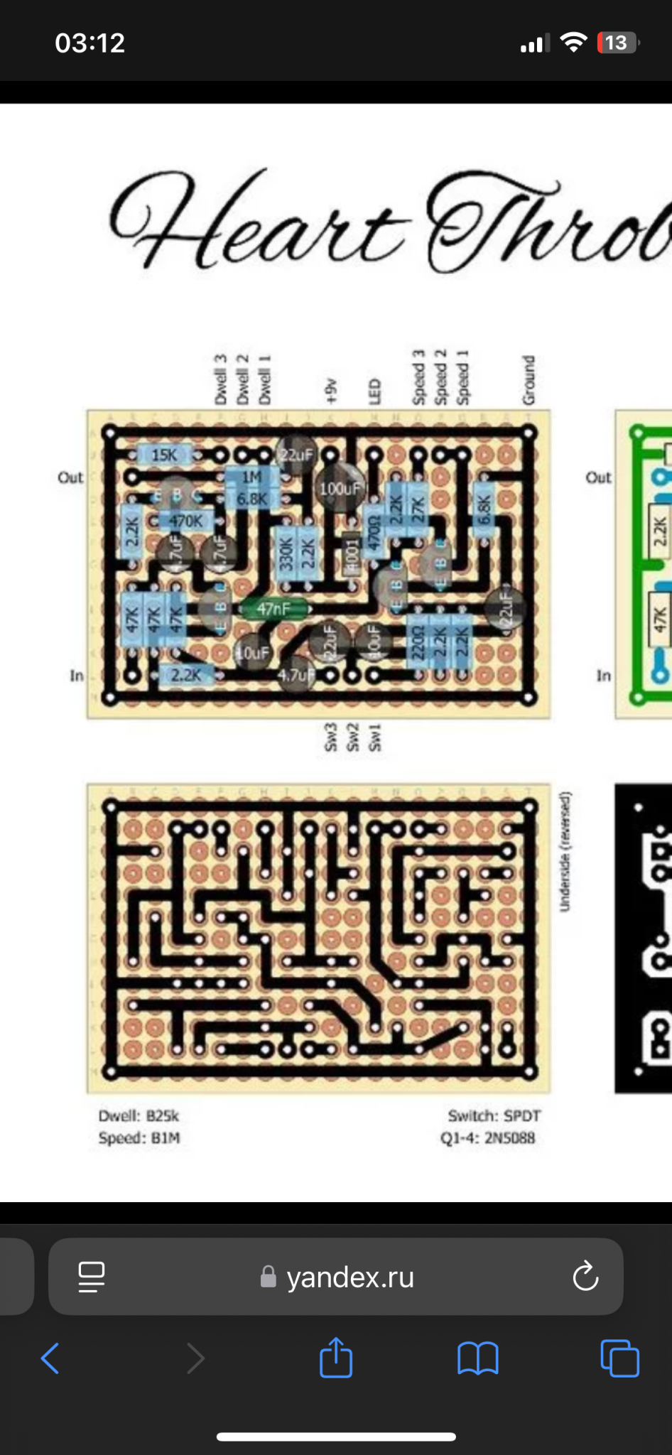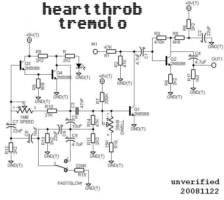 ... и добавил:Привет всем, собрал тремоло, в общем все работало, решил поменять светодиод (просто для эксперимента) включаю - не работает, поменял обратно на тот который был - не работает, в момент подачи питания Один раз мигает и гаснет. Не понял юмора, что могло произойти, транзистор кстати на который идет +9в сильно греется, примерно градусов 90-100 (не знаю, может так и надо)