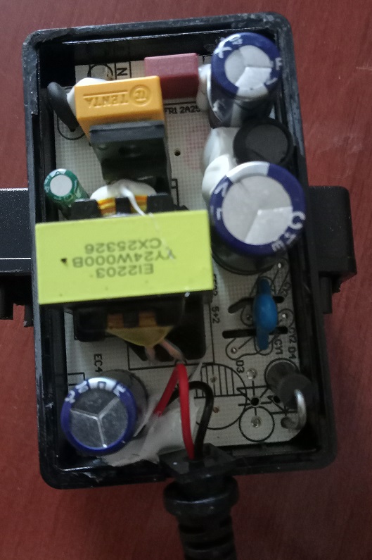 Подскажите, есть такой БП от аквариумного светильника, когда свет отключается нагрузка на БП падает и он начинает свистеть. Разобрал, потыкал деревянной палочкой дроссель т.к. сначала думал он виновник, но оказалось что синий керамический кондер, придавливаешь его палочкой и свист практически исчезает.