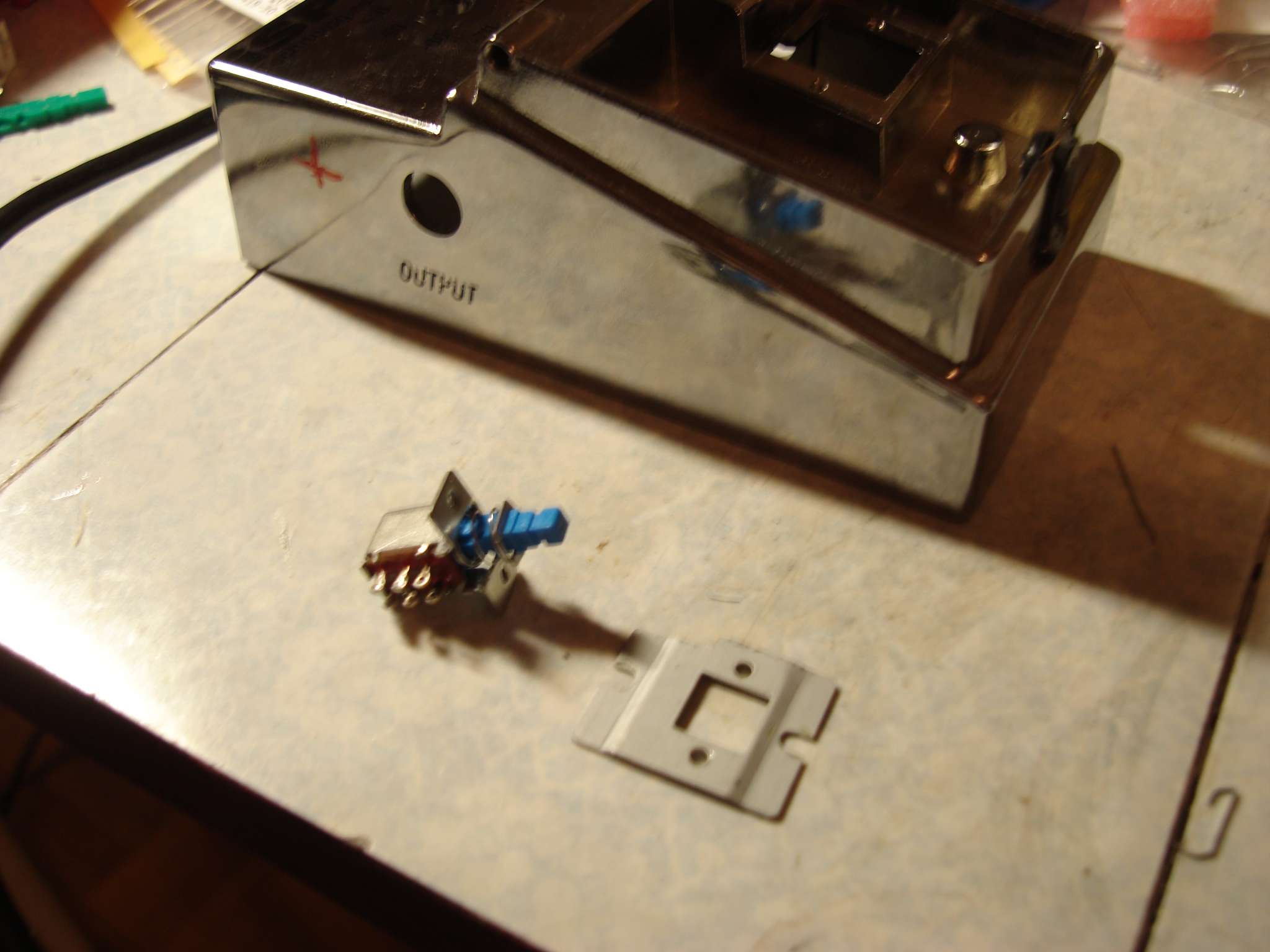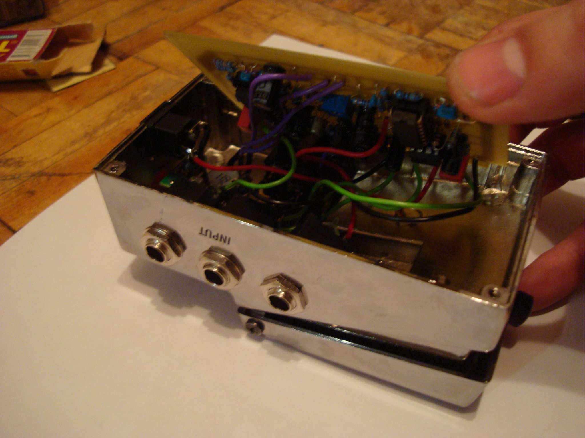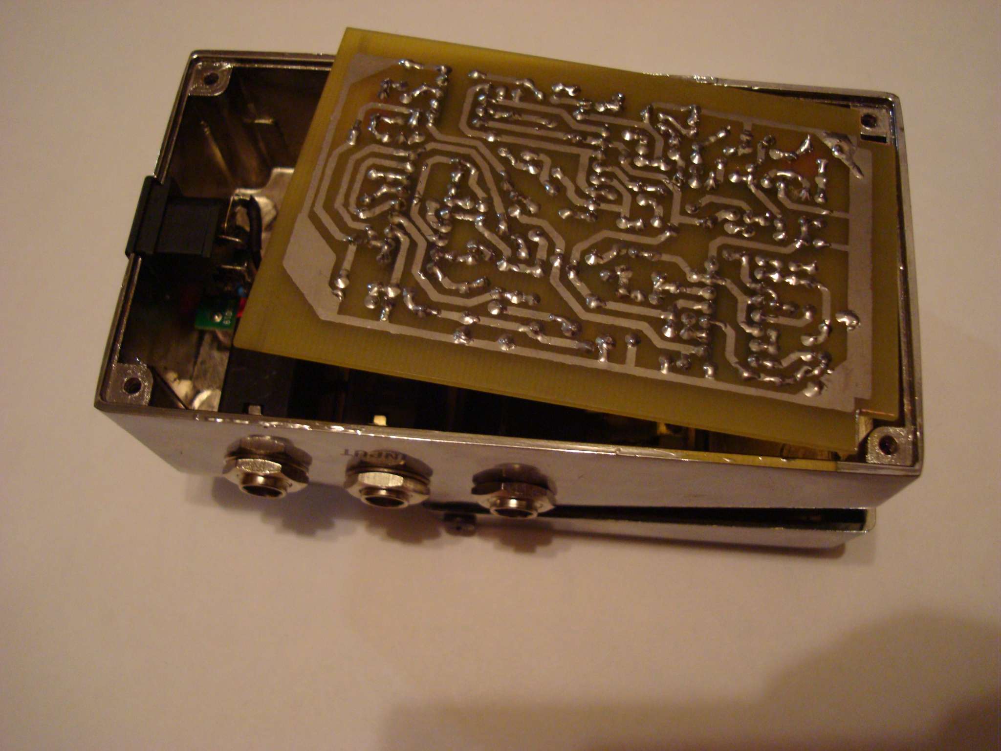 С байпасом я заморачиваться не стал - просто нашел точно такую же кнопку, но с фиксацией. А работать педаль отказывалась по весьма банальной причине: в качестве флюса я использовал ТТ гель (такая розовая хреновина для пайки SMD компонентов), так вот послушав то, что пишут на коробке я не стал его смывать (это якобы должно афигенно защищать пайку и все такое). Но в какой-то момент, когда был уже доведен до отчаяния (вытравил новую печатку и собрал все чуть ли не со вторым комплектом деталей), я решил отмыть плату и... все тут же заработало.