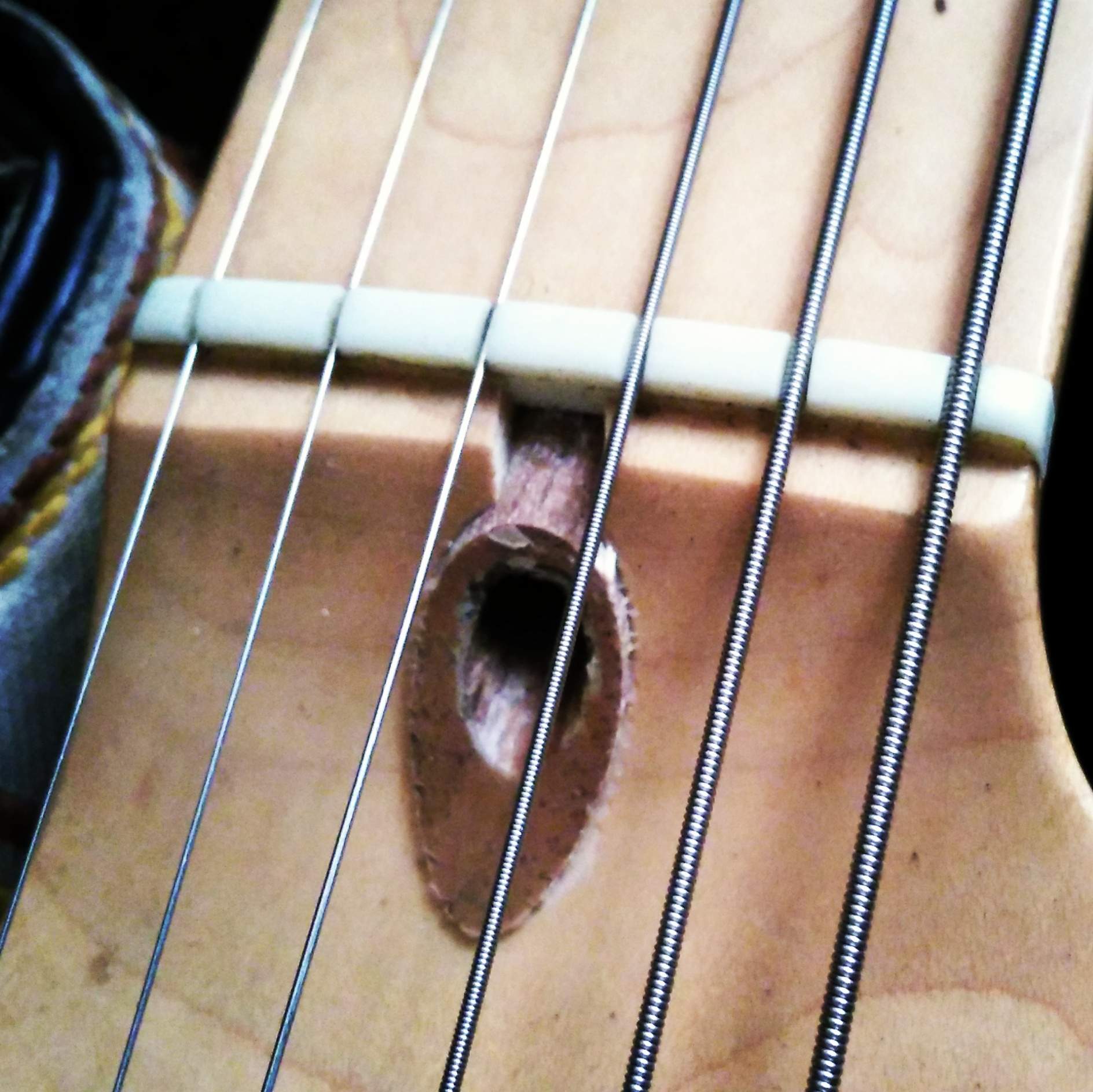 Струны оказались неожиданно толстыми и всё стало немного не так, как раньше. А учитывая классический бридж хайвеев и не вот уж прямо какую эргономику телекастеров в целом, играть было крайне неудобно. Сейчас чуть удобнее.