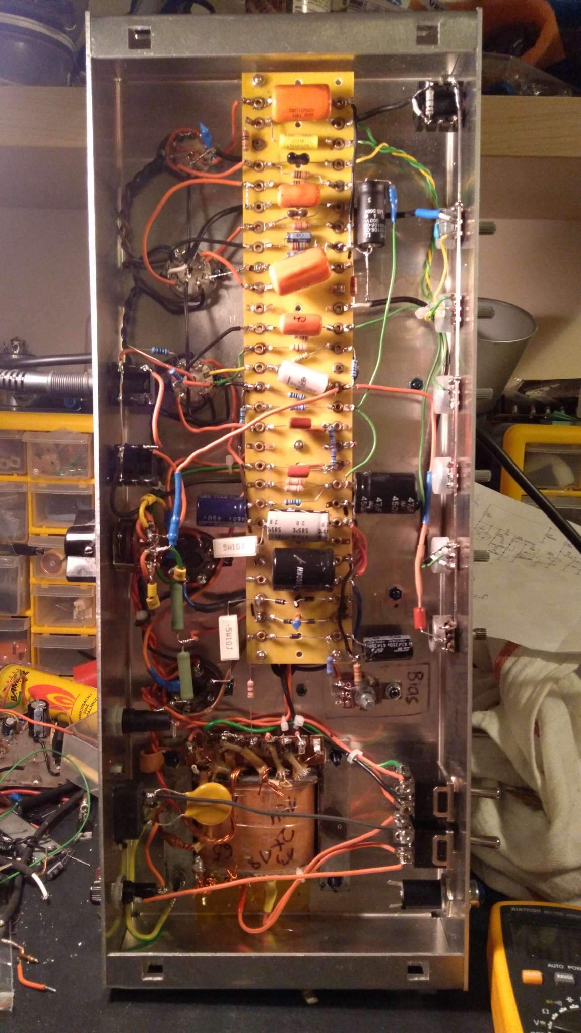 Сравнивали с месой ректой соло (50вт) и самодельным фендероподобным 100вт усилителем (там классика - 1 лампа в преде, 1 в ФИ, и оконечник на 4x6L6, не знаю кто делал) - и вот тот, что получился у меня - звучал, как усилитель совсем с другого класса - более насыщено и сочно, с офигенным кранчем, после половины гейна. Гитарист даж как-то расстроился немного (его фендероподобный усь звучал уныло и скучно по сравнению с новым). Все игралось в каб на 2х12, с Eminence Legend (точную модель не знаю, каб закрытый, владелец уже точно не помнит). В общем - я очень доволен. Осталось оклеить толексом будку, дождатся панелей на усилитель, и в субботу можно отдавать клиенту. )