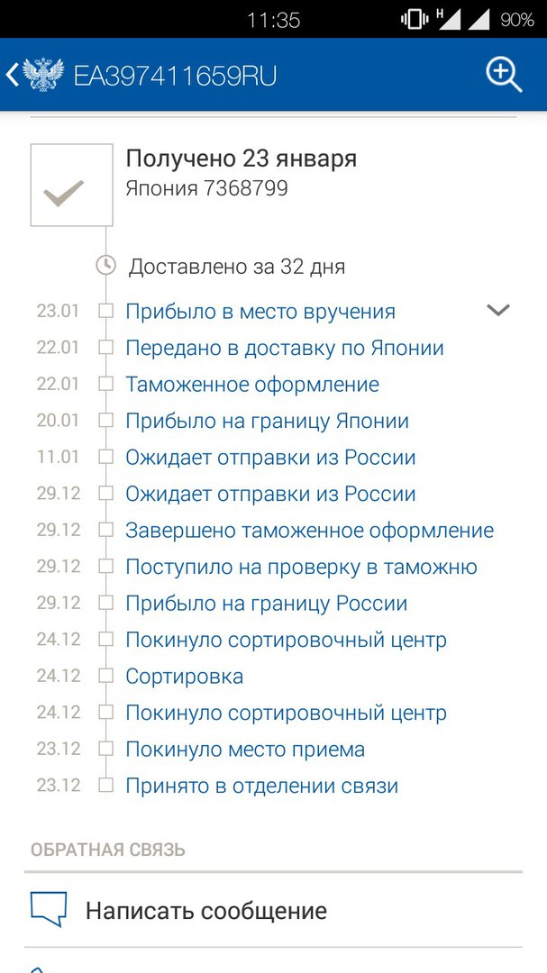 Перед новым годом, вечером 29 декабря, на свой страх и риск заказали с ребенком ему подарок. Сильно я сомневался, что в новогодние праздники доставка будет быстрой, однако отправка случилась EMS-ом, причем продавец отправил посылку уже утром 30-го, 2-го она была на границе России, 3-го прошла таможню и сортировку почты, а 6-го я забрал ее с почтового отделения! Первый раз у меня было такое с Почтой России, чтобы за 8 дней, да еще и празднично-новогодних.
