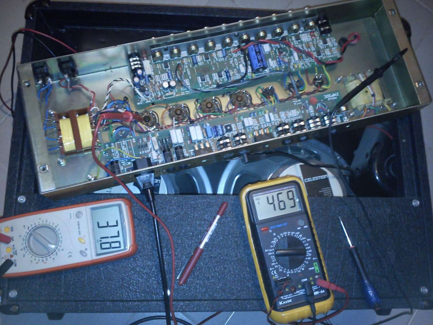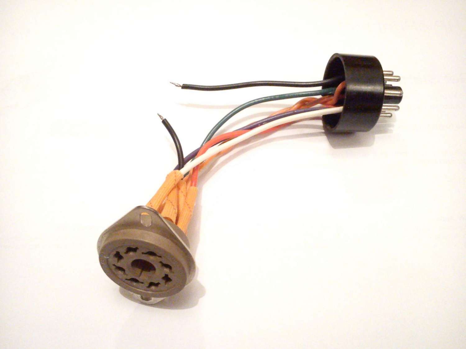 Тогда я сделал адаптер из цоколя лампы и из пластиковой базы старой лампы.Спаял все кабеля пин к пину , а восьмой пин в разрыв , на него повесил мультиметр.И уже тогда сдвинул немного подстроечный пот.Показывало около 33мА, TAD на своих EL34B STR рекомендует 39мА , я и выставил 39мА, напряжение на 3 ноге упало до 466 вольт.