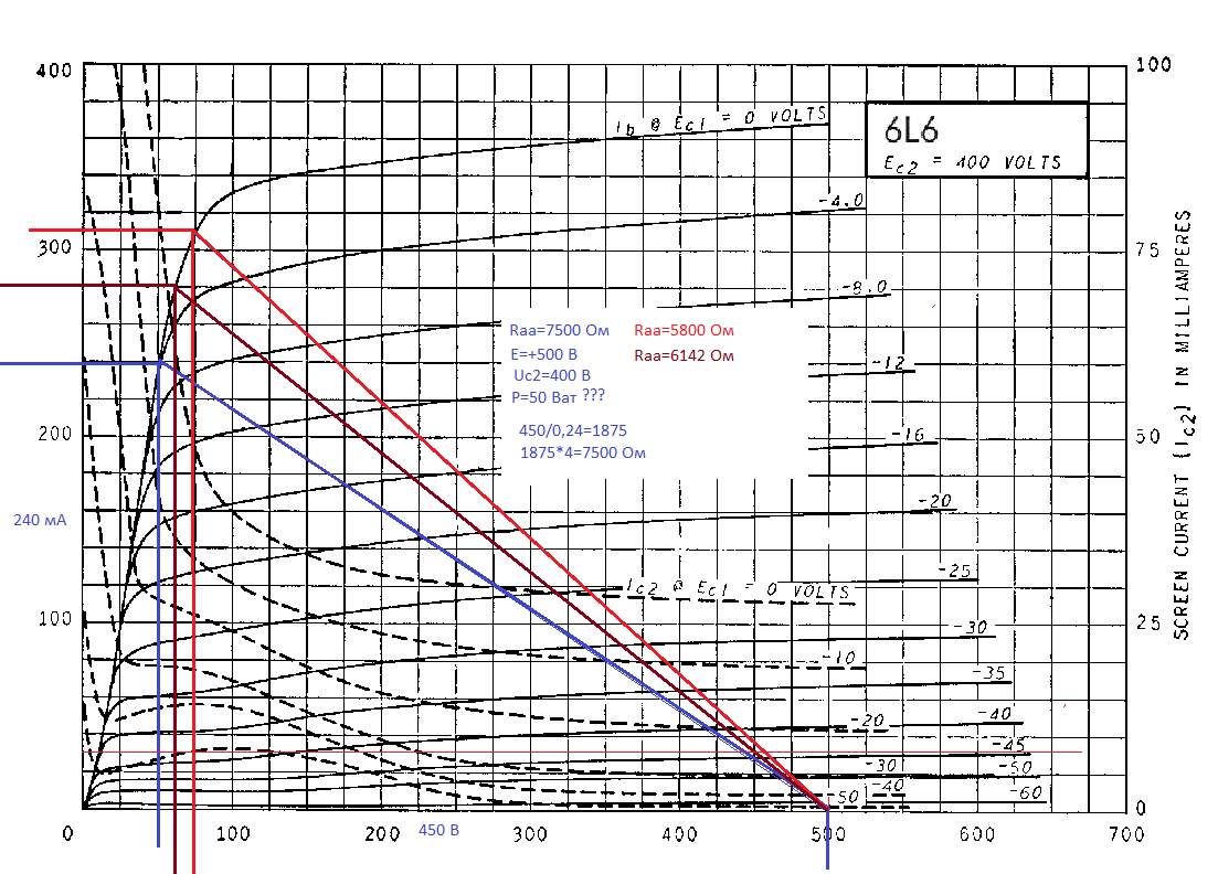 Законы я доказывать не буду, сам в них не силён, меня так научили,я так считал не раз, результат положительный. Rа для 6П14П 5,2 кОма, от куда, для какого режима? Я считаю по ВАХАм, потом мотаю, при намотке вношу поправки, как витки лягут не просчитать точно, поэтому плюс, минус))) если подбирать готовый тоже не всегда точно подберёш, вот для примера как у меня получилось для 6П3С-Е Е=+500 В Uс2=-400 В. Если есть желание разобраться досконально, надо прочитать массу литературы, удачи, я профессионально этим не занимаюсь поэтому ограничился Цыкиным)))