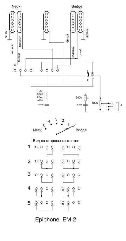 т.о., я могу в каждом положении переключателя прозванивать данный 4 контакт с остальными контактами. т.о. и составлю схему переключений. так же разобрался со схемами подключения потенциометров. черный провод отвалился от корпуса потенциометра тембра, вследствие чего потенциометр получается не имеет подключения к общему проводу и не работает.