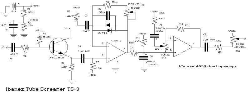 С другой стороны, модель TS808 (производства 1979-80 годов) выпускалась, как и было задумано, с микросхемой JRC4558 и поэтому копия TS808 имеет ту же спецификацию.