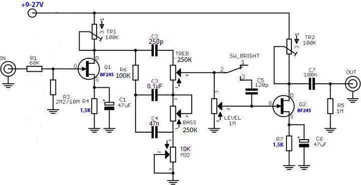 Классический "фенедроподобный" пред, базирующийся на преде от Alembic f2b. Но на полевиках, с низким (до 30в) питанием. Полевики - BF245A. Можно и Б, но мне на А больше понравилось. Они держат до смерти - между стоком и затвором до 30В. Так что рекомендован БП для них не превышающий это напряжение. Идеально - 24-27в. После настроки преда будет конечно меньше на транзисторах (половина питания), но чтобы они у тебя не померли при первом же включении - постарайся чтобы у тебя не было в бп более 30в.
