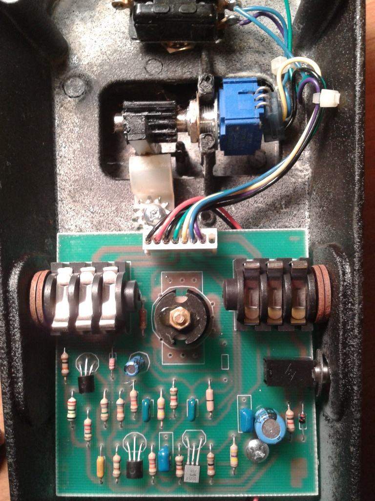 В первую очередь: убираем входной буфер, не трогая дорожки, оставляем отверстия "пустыми". Далее в левое отверстие выпаянного транзистора впаиваем провод - теперь это effect input. Далее в контакт верхнего резистора впаиваем второй провод - это земля. Далее делаем два отверстия в дорожках рядом с джеком питания
