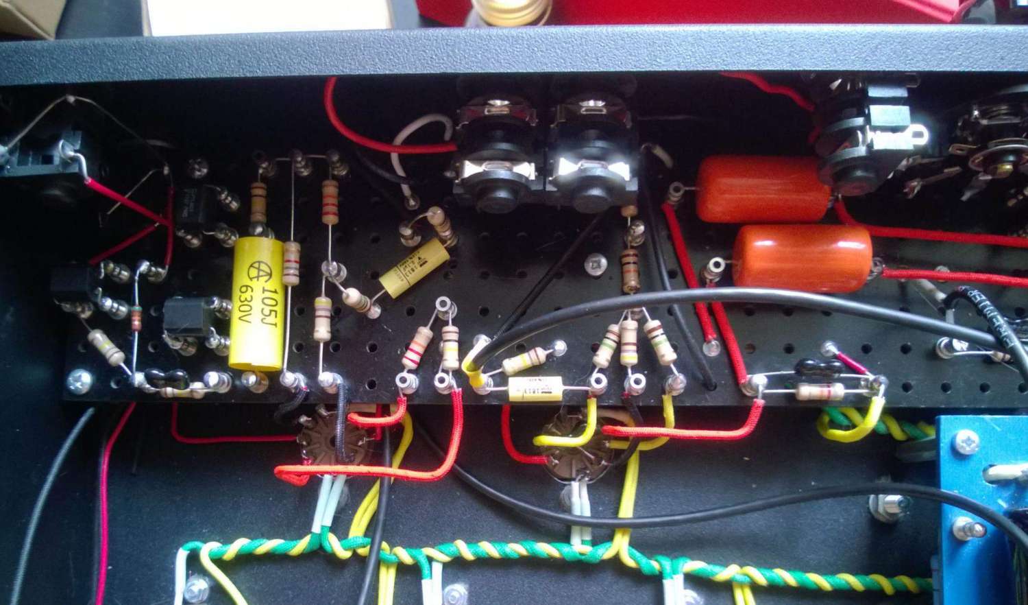 Фотоаппарат временно недоступен, поэтому фото с телефона, правда до того, как я плату почистил. На ней собстенно размещаются обвес петли и фазоинвертора. Плюс собрана плата переключения каналов. Тут есть пара моментов, требующих внимания. По порядку: цепь обратной связи усилителя. во-первых ее достаточно много (в сранении с другими усилителями): здесь связка 10k/4.7k от 4омной обмотки.Плюс LC цепь с резонансом порядка 140 Герц. Плюс нестандартная ручка презенса, которая контролирует больше верхнюю середину (а к концу и громкость - заземляя болшую часть частот), нежели верха.вообщем, роль ее в формировании звука высока.Найти индуктор не самая легкая задача. Изначально я пытался найти оригинальный 3с81 - но их легче достать несколько сотен, чем одну. Поэтому остановился на рекомендоанных к применению в аудио