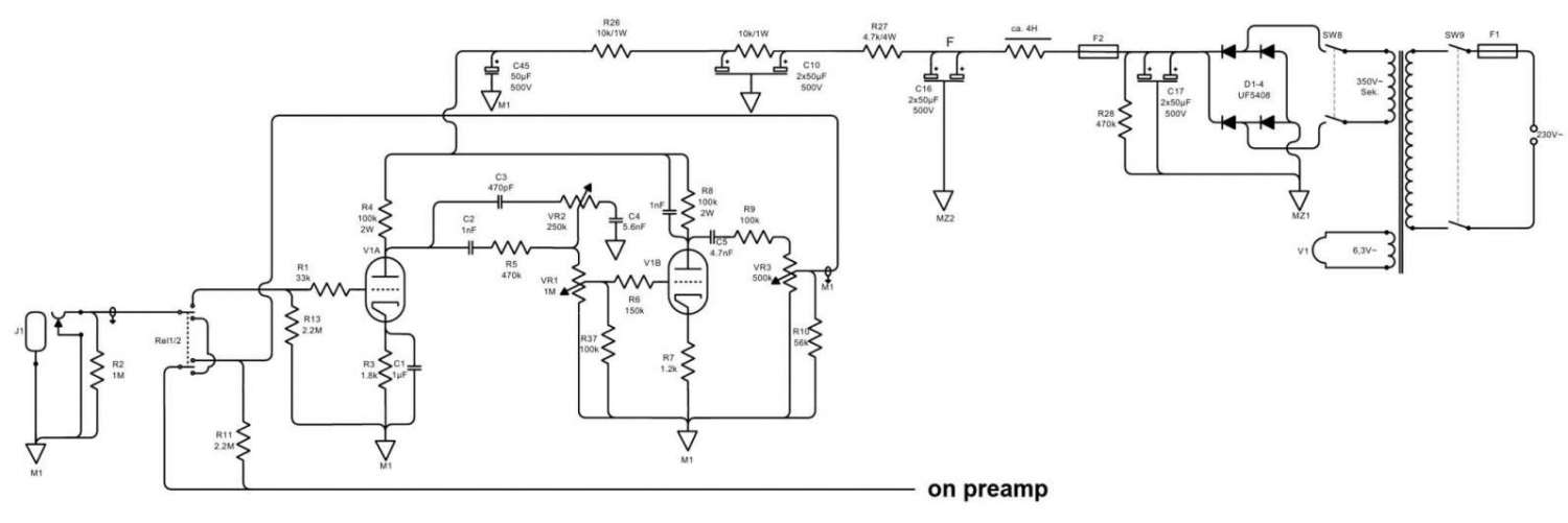 Единственое замечание по поводу схемы, там не надо таких конских доз элетролитов ни дроселей , кто то содрал этот бустер с оригинальной схемы и дорисовал источник питания со всего усилителя.Вполне достаточно двух кондеров по 22 - 47 микрофарад вольт на 450.Tраф со вторичкой 350волт тоже слишком перебор, хватит вполне 250 - 270 , после выпрямителя будет где то 350-370 вольт.Я свой вариант этого бустера кормил от 340 вольт.Да, и на входе в первый триод надо ставить 1мег, а не 2М2 как на схеме, там 2м2 для того чтоб в паралели с другим предом выходило 1м.