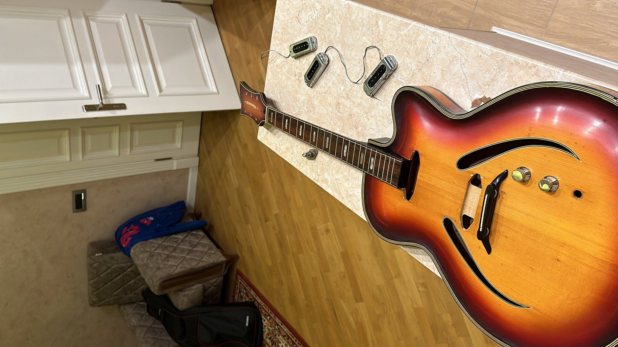 Переворачиваем звукосниматель магнитом вниз и прилепляем к нему плоской головкой винта получившуюся конструкцию.
