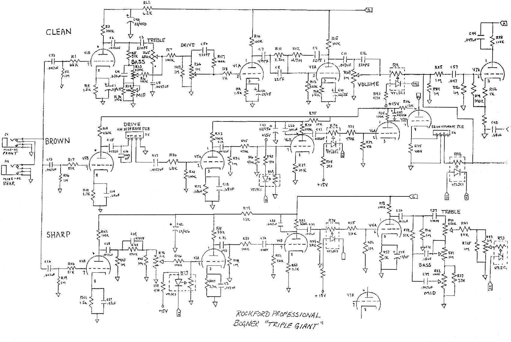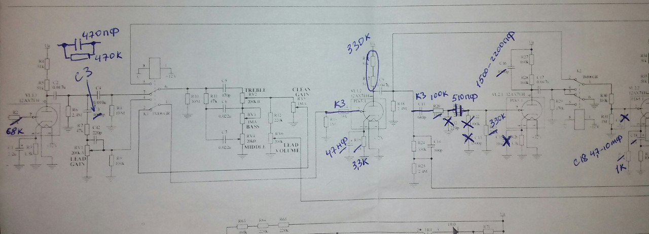Всем привет,может кто имеет схему мода птеры от комрада AZG,b-mod.Получил ответ от AZG что за основу б-мода взята схема канала Sharp от Bogner Tgiple Giant.Я как паяльщик с унылым опытом(фузики,кранк дисторшны,бустеры паял) там никаких сходств с птерой невижу кроме количества ламп.Может кто ткнет чего там заменить в птере что бы получить б-мод.Нашел инфу на форуме что нужно поменять потенциометр gain lead на 1мОм и кондер C1 на 10мКф