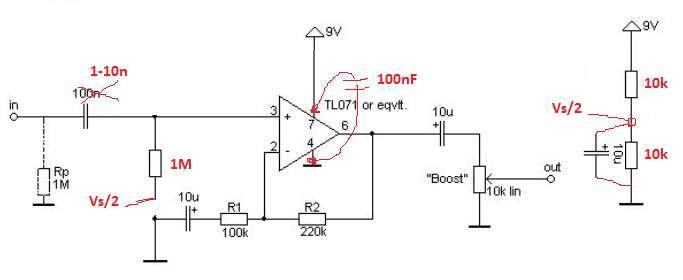 Зато с 100 нФ существенно меньше фликкер-шум, т.к. его реактивное сопротивление меньше, и поэтому на ИНЧ/НЧ гитара луше шунтирует шум 1МОм-ного резистора смещения на неинверт. входе. Если дальше стоит хай-гейн, то фликкер проявляется в виде кипения, шуршания и т.п. Я бы рекомендовал 47-100 нФ. Разница не очень большая, но если хочется перфектности, то это один из моментов в нужном направлении.