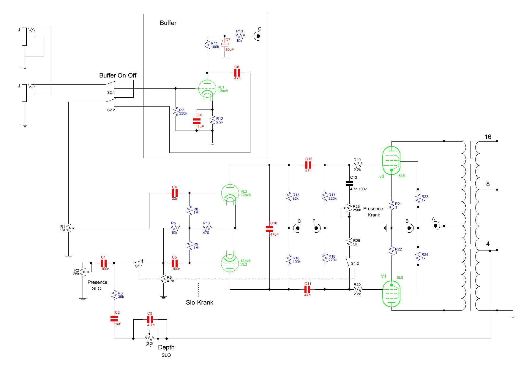 Пока шла посылка с слесарно-паяльным добром ( на Чукотку в средне 30-40 дней ) засел за изучение теоретической стороны моего проекта. За этот месяц я прочитал наверно все темы на форуме связанные с лампами , реками , усилителями мощности , кое в каких даже рисковал спрашивать , параллельно с чтением продумывал компоновку усилителя . Решено было делать с отключаемым буфером и ОСС и подключаемой регулировкой CUT. Нарисовалась такая схема :