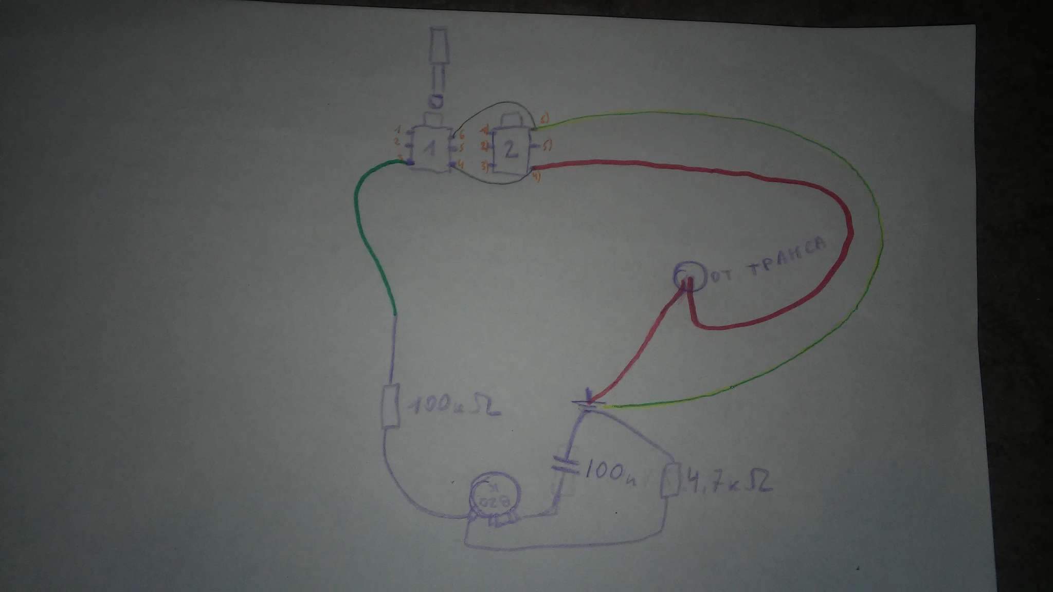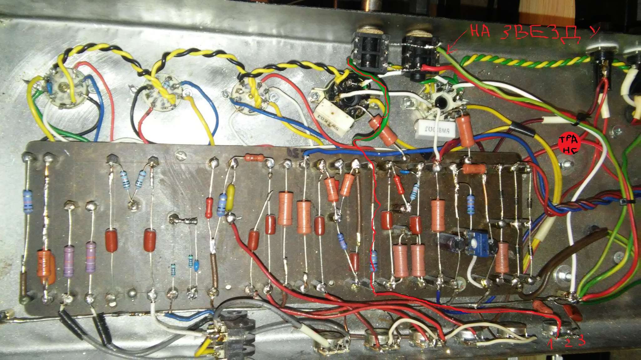 Из трансформатора выходит две обмотки (красные), один провод идет на гнездо выхода, другой на звезду....... короче я нарисовал см. фото.