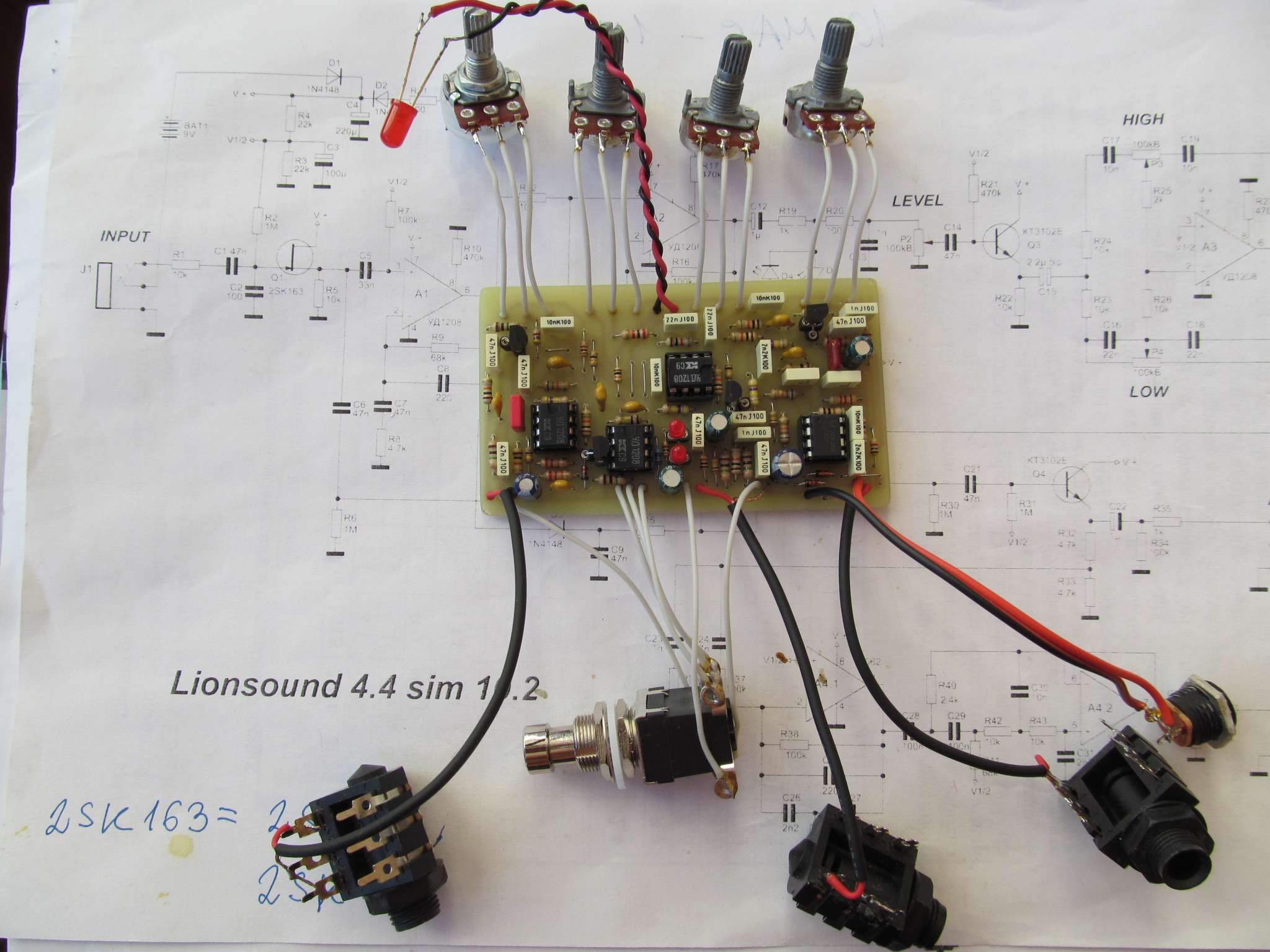 Вот на днях тоже спаял эту крутейшую примочку ( версию Lionsound 4.4 - sim 10.2 ). Спасибо большое автору за схему и печатку!! Звук крутейший, реально похож на ламповый хай-гейн, рычит действительно как лев , зерно крупное , читаемость отличная. Сустейн тоже порадовал, из всех моих прегрузов -самый длинный сустейн. Но пока наводки ловит , но это пока без корпуса я надеюсь. И ещё светодиоды в цепи ограничения так мерцают во время игры , хочу вывести их на корпус , чтобы мигали . Скоро буду собирать всё в корпус, уже насверлил отверстия.