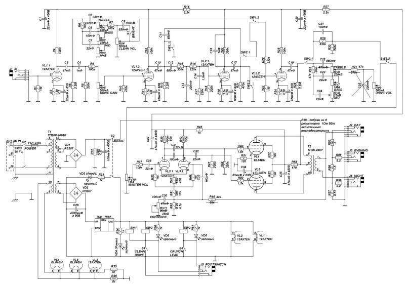 Для начала была в очередной раз изменена схема, был устранен резистор в цепи сетки первого триода, а также почиканы 100омные сопротивления в цепи 12В постоянного тока (при постоянном накале они особого смысла не имеют), минус от 12В был включен на землю.