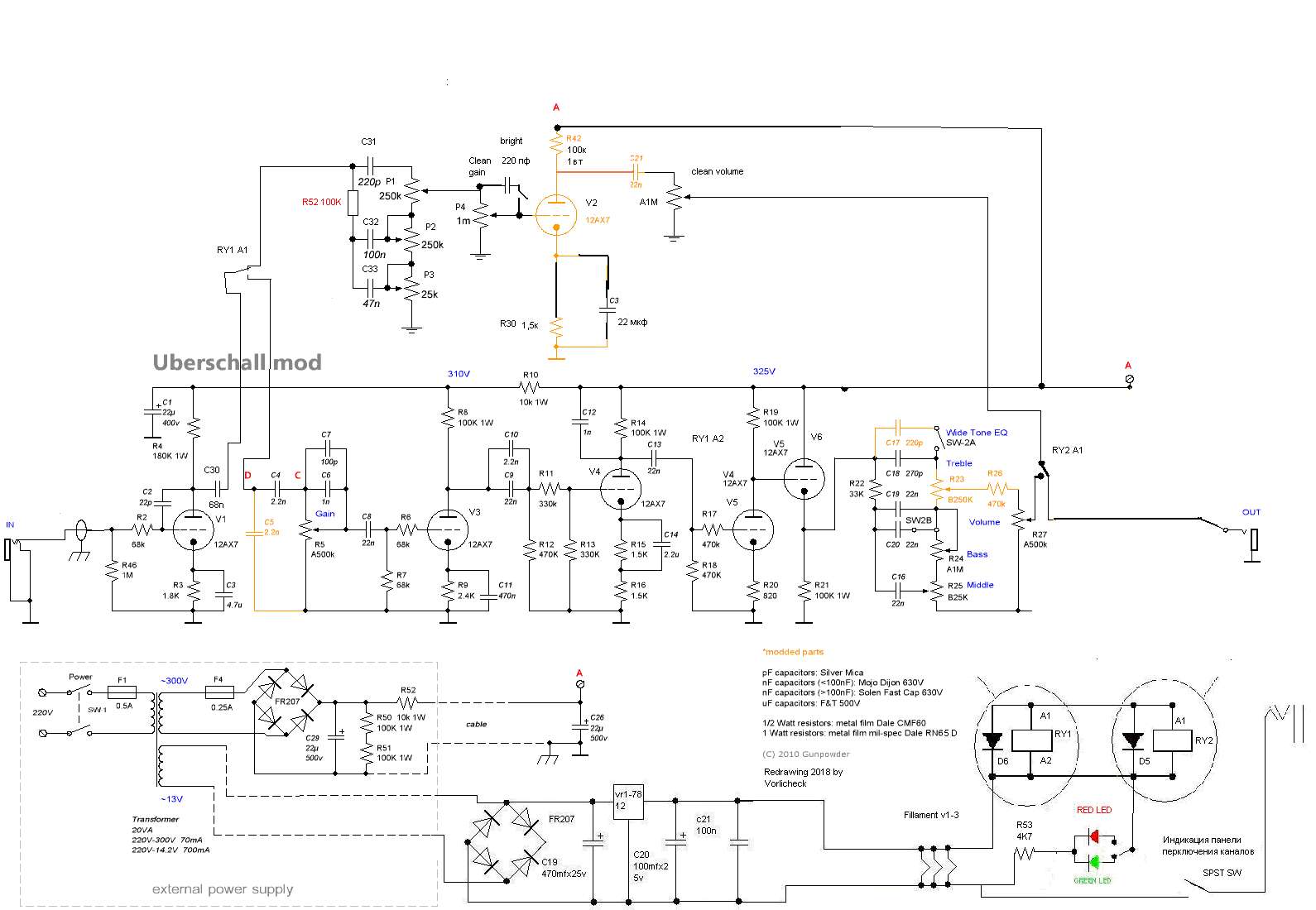 Либо после Тонстэка клина еще каскад усиления (тоже с большим электролитом в катоде), чтоб 'обойти' связку V4,5 из перегруза. А после уже на реле перед выходным повторителем.