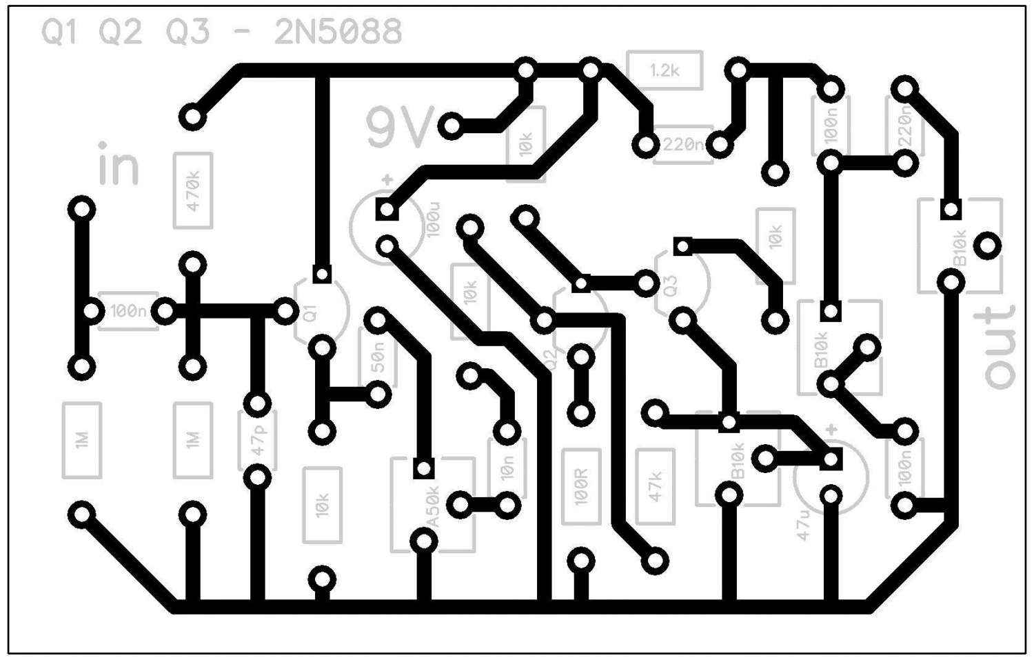 паять только начал и эта педалька на трёх транзисторах и чуть посложнее предыдущей.