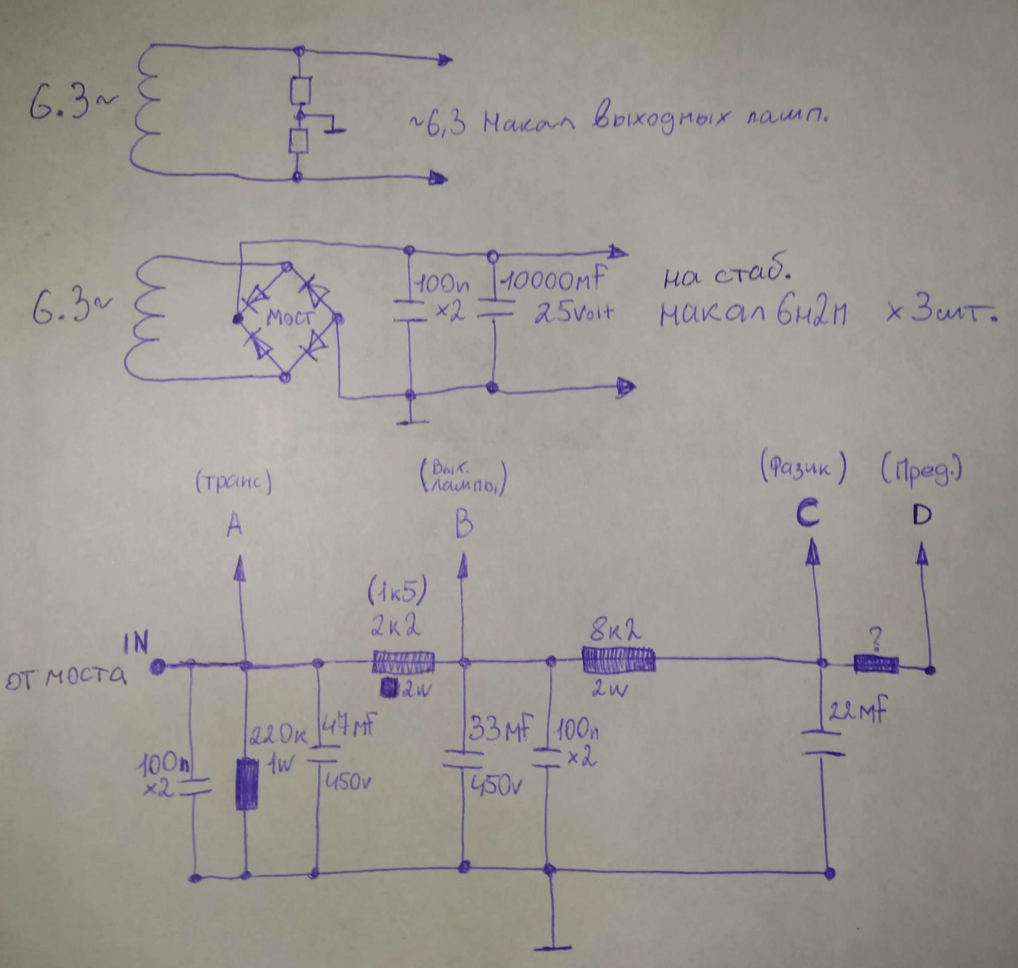 P.S. Нашёл и добавил рукописный набросок схемы БП. Не отрисованы выпрямитель в высоковольтной части и стабилизатор на LM-ке на накале преда, но это любой, кто держит паяльник, может додумать сам.