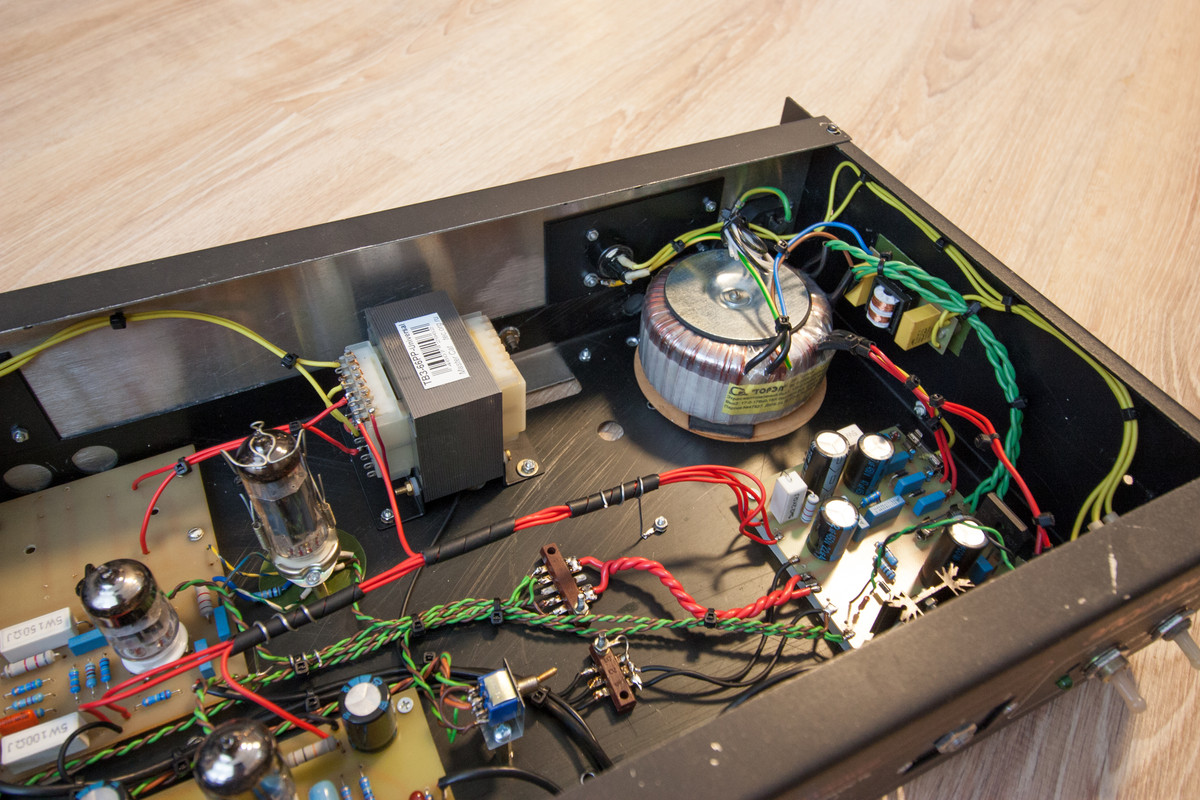 https://www.yerasov.ru/catalog/transformatory/transformator-silovoy-ttp-80gvrЛампы 6Н2П-ЕВ, 6П14П. Покурил форумы, Гитарплеер, Гитар_гир и Гтлаб. Нашел подходящую печатку преампа за авторством ITO и доработал её под свои нужды. Внутренности Эпсилона были удалены из корпуса, корпус доработан. Переборка делившая корпус по горизонтали на два отсека стала дном корпуса, лишние отверстия зашиты пластиком.Количество ручек на Эпсилоне хорошо подошло и для моей конструкции. Печатка оконечника рассчитана на внешнюю установку ламп и выходник ТП135-ТВ3-10 впаянный в плату. БП выдаёт 326 вольт под нагрузкой. Схему не отрисовывал, она типовая, за исключением того, что выпрямительные диоды быстрые и шунтированы помехоподавительными кондёрами . На входе БП на отдельной плате сделан входной фильтр. Схему БП разрабатывал с оглядкой на статью Denn-a на Гтлабе