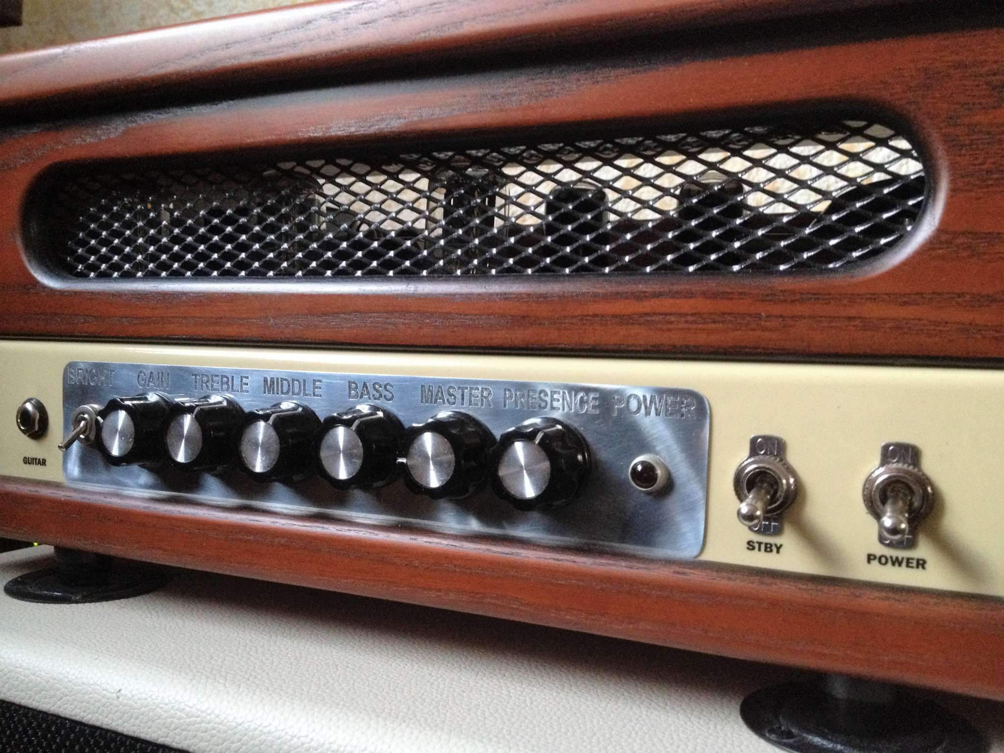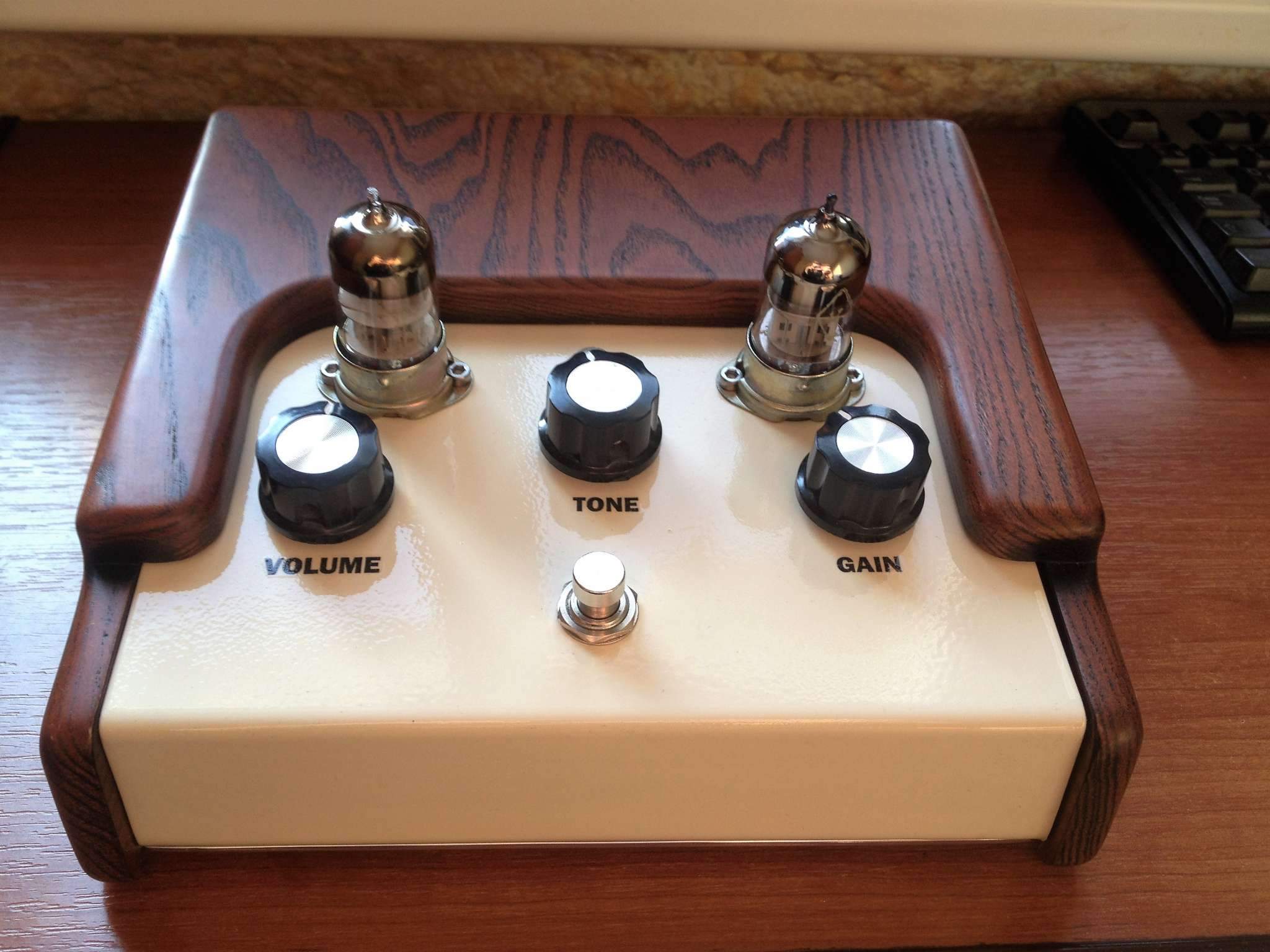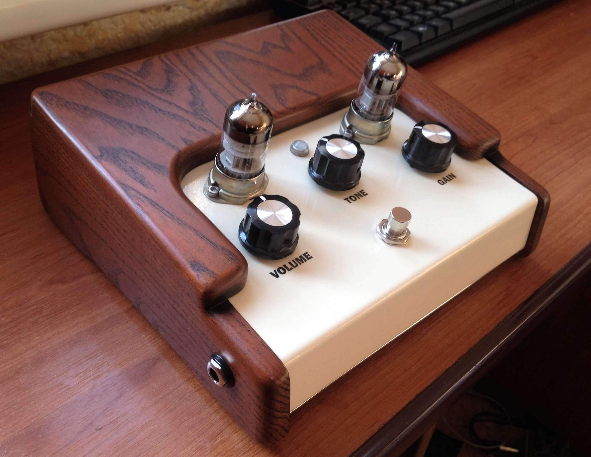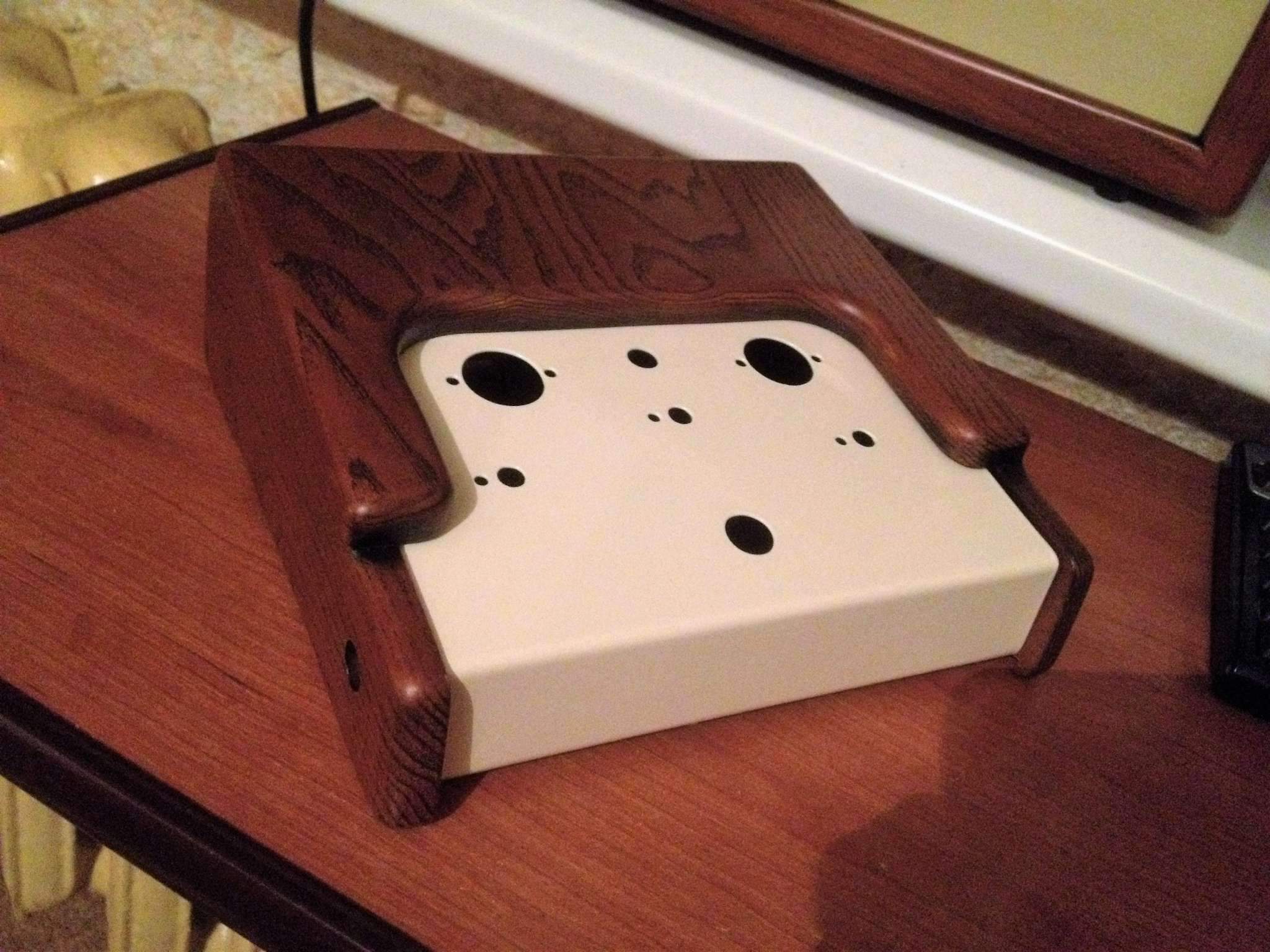 Я сначала хотел сделать просто боковины из дерева, но потом решил иначе - во-первых, встал вопрос крепления боковин к корпусу, а во-вторых, хотелось как-то скрыть все крепежные болты на лицевой стороне (там у меня прилично болтов - питающий трансформатор крепится, печатная плата), вот и родилась идея сделать еще и верхнюю накладку из дерева. Да, получилось немного громоздкая конструкция, но вроде симпатично. Для диванной игры вполне годится, ну и хотелось, чтоб дизайн был схож с головой, которую недавно собрал, чтоб типа комплект был)