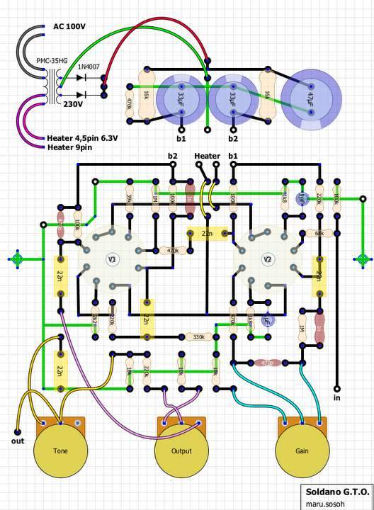 2VLDS-я знаю,что и вы,и М1G владеете предметом,поэтому пока на пальцах-кроме того,что я уже упомянул выше-после 22н 1-го анода параллельная цепь 1н и 1м-вместо 1н запаян 620пф,далее вместо 470пф перед 470к и сеткой 2 каскада.запаян 1200пф,пот гейна крайним выводом напрямую соединен с корпусом-,,землей,, резистор 10к убран.Выход3-его каскада после разделительного С-22н через тумблер и резистор 33к соединен с землей-это переключение кранч-лид.Совсем не отрисован тон стэк,он 3-х полосный.Это я с исчерканой ручкой схемы вещаю,вот пока что так,ну и +то что я говорил выше,кстати тот,кто ее сделал,заменил 39к в 3-м катоде на 22к-ему так больше нравилось,но окончательный мод и ему,и мне нравится больше всего.Вот как-то так С Ув.Жора.