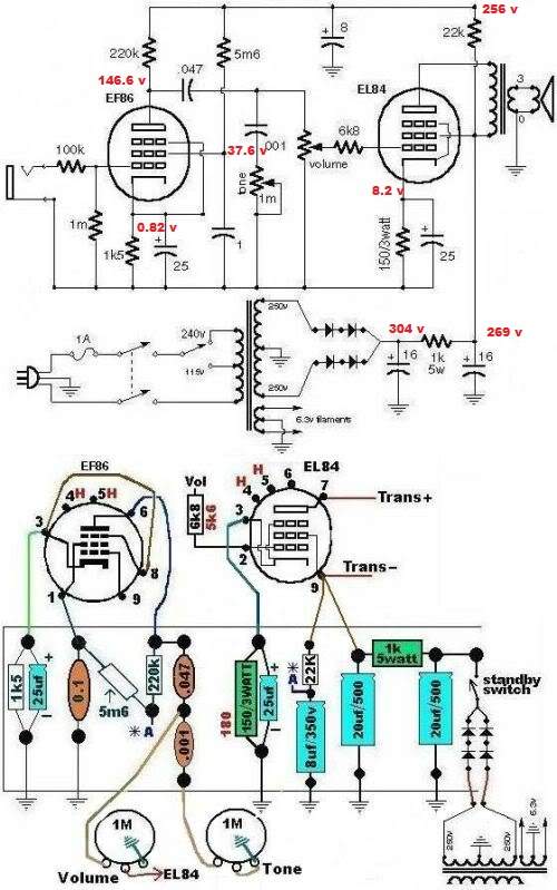 Был заинтригован и собрал я этот девайс на макетке. Как и говорит Олег Кононов, катодный резистор пришлось корректировать до 3 кОм, чтобы добиться смещения как на схеме. При уменьшении анодного резистора падала мощность. Все бы нормально, и звук чистый, и не фонит, но громкость мне показалась маловата. Пересобрал выходник на 6п3с. Все равно не хватает амплитуды для раскачки выходного каскада. Не знаю, может что то не то делал. Но два триода с ТБ между ними раскачивают оконечник намного сильнее.
