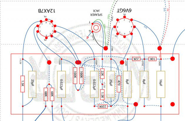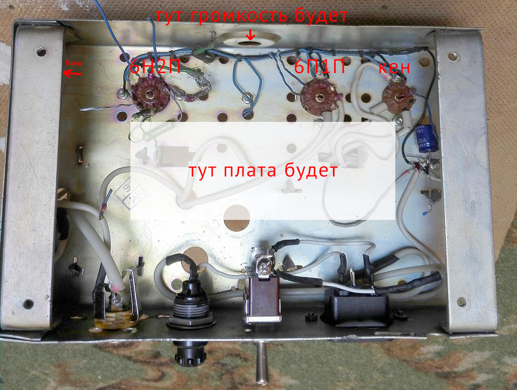 - проводки от входов вообще не нужны - резисторы по 68к сразу в контакт на ламповой панельке пойдут. навесочкой же. там расстояние - самое то. поэтому и плата упрощается, всё получается ближе и логичнее, и ненада провода кругалями тянуть как было бы с чемповской раскладкой платы, и вся земля на плате - в одну пипочку складывается... я ж не от балды рисовал, а по неоднократно проверенному.