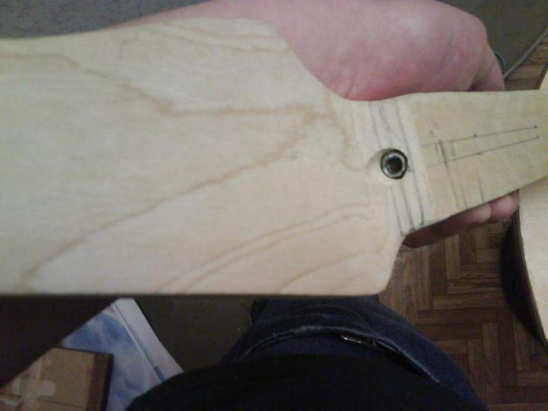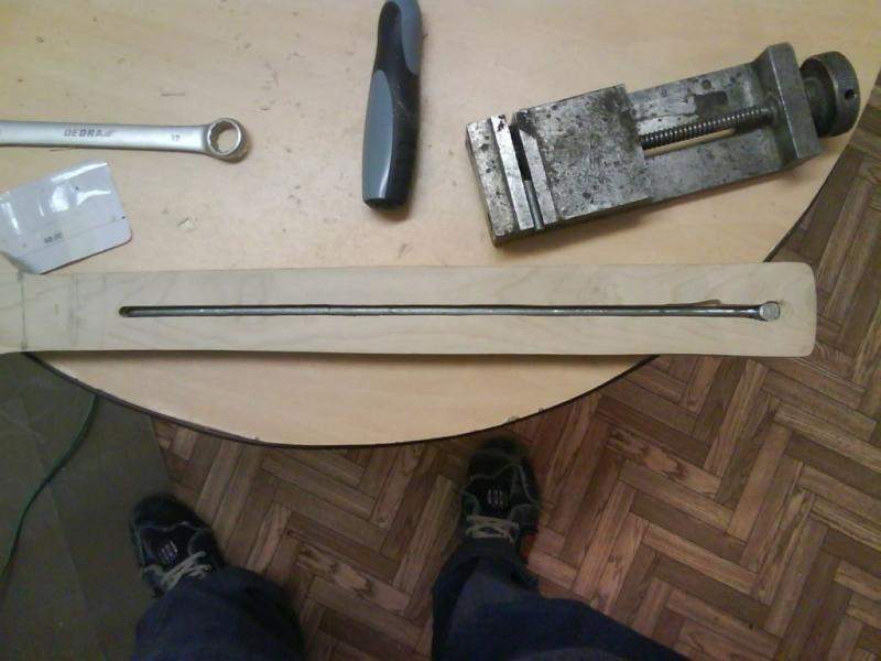 Насчет покраски - добыть пульверизатор и заделать покрасочную комнату с вентизяцией впринцыпе не проблема... Так что насчет покраски благо еще есть время подумать. Сейчас Важный момент - грамотно запихать в это чудище анкер. Кстати об анкере - в местном инструментторге нашел метровую стальную шпильку с уже навороченной резьбой 6 мм. Завтра достану где нить кусок прута на 12 мм, чтобы его в пятку забить и буду искать знакомых токарей чтобы мне под шестигранник гайку зае...забабахали. В понедельник - вторник наверное заклею анкер рейкой. И останется только вывести профиль грифа, задать радиус и где нить нарыть шлицовку чтобы пазы под лады выпиливать. На днях еще закажу лады с гитарпартс.