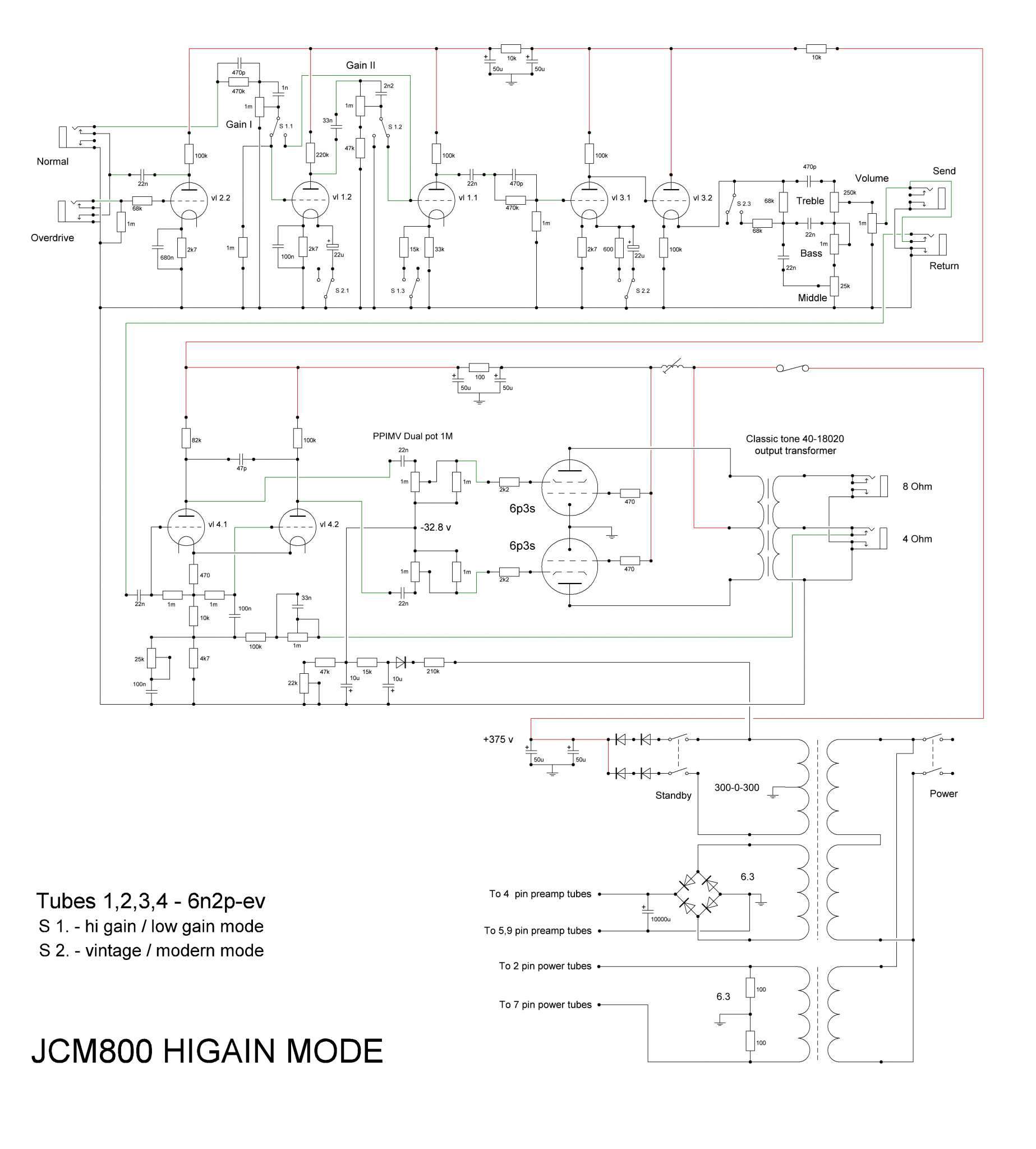 Уже долго пишу эту тему и пора сделать вывод. Усилитель получился очень функциональный. В лоу вход можно нарулить и чистый и сочный кранчь не похожий на кранчь с хай входа. На хай входе это всё тот же известный овер с лязгами и круглым басом. В режиме хайгейна он превращается в монстра с родни мессам и солданам. Да плюс возможность менять эквализацию усиления. Ещё и ппимв, дипы, презенсы. Можно получить разный звук. Этим усилителем я очень доволен. И хочу поделиться схемой с вами. Может кто и возьмёт чего полезного для себя из моих эксперементов.