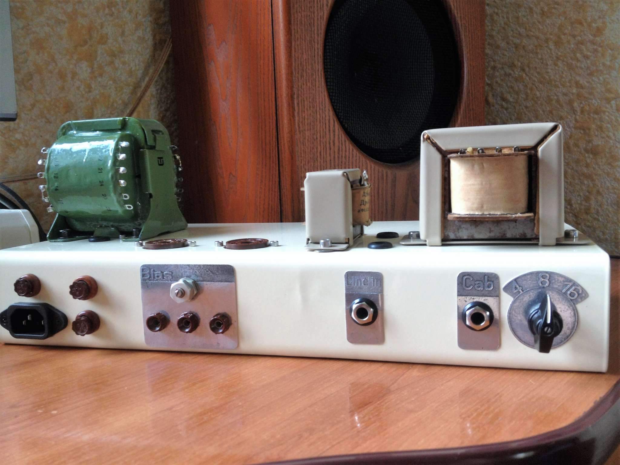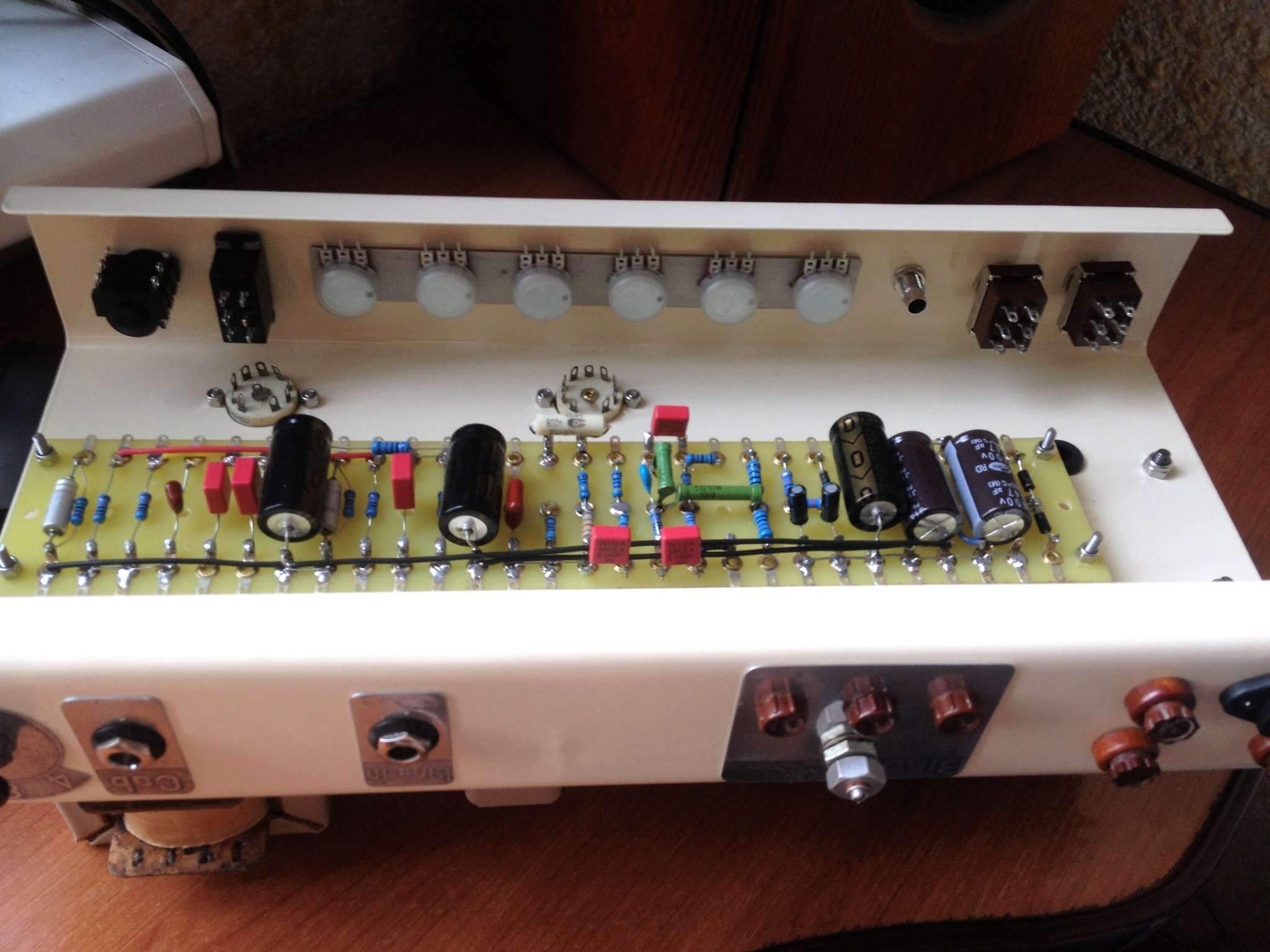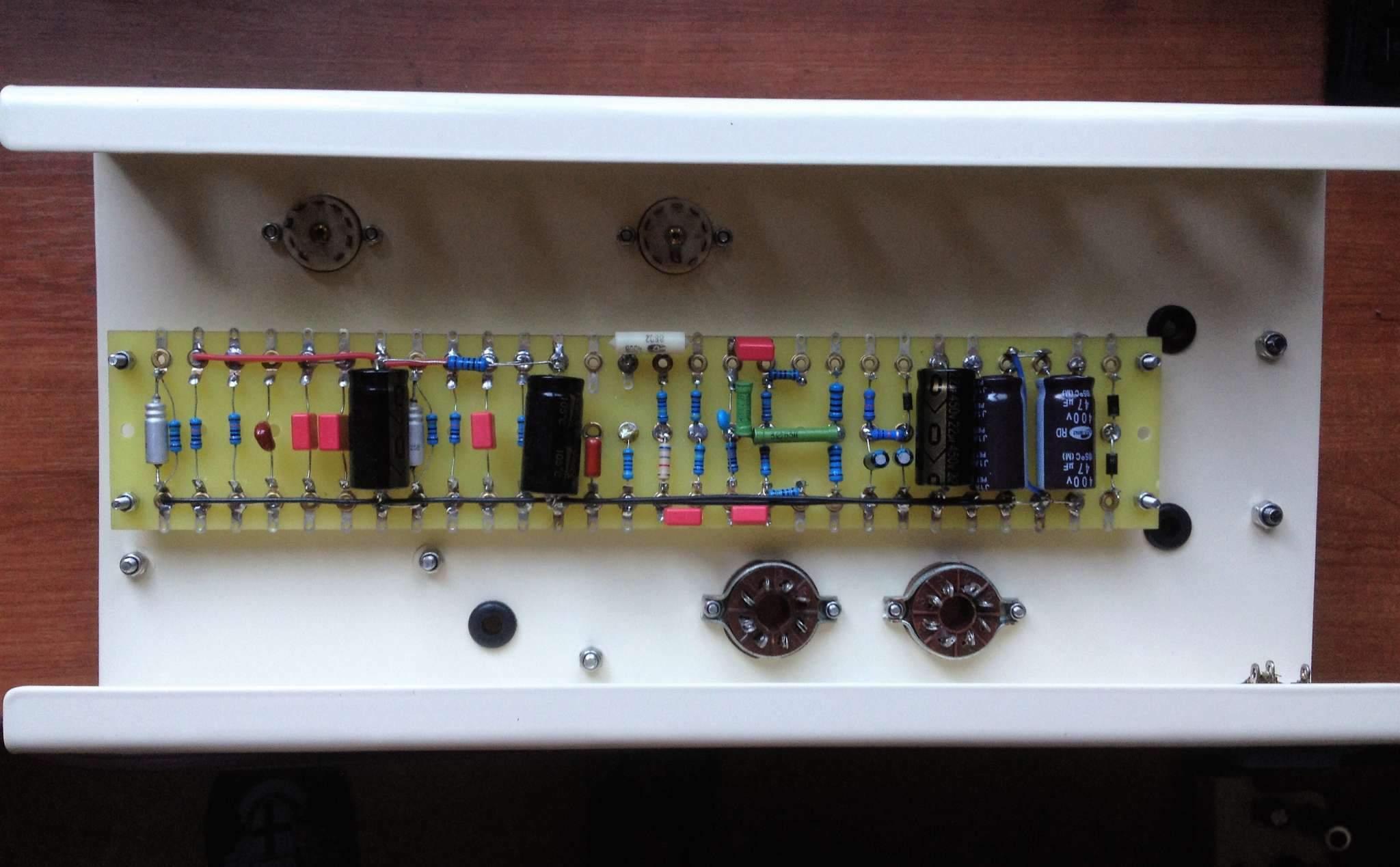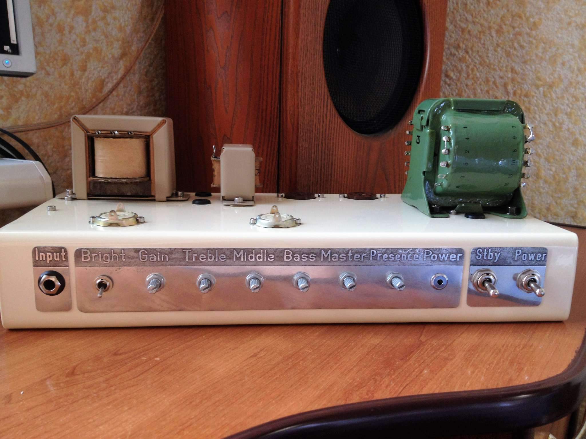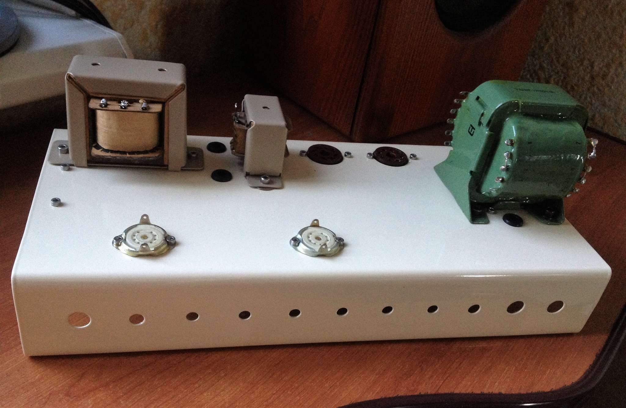 Вот, тоже решил запилить нечто похожее. Ну то есть почти похожее. Схема та же, только на выходе 6п6с. Ну и в силовом трансформаторе анодная обмотка со средней точкой, соответственно, выпрямитель тоже другой, двухполупериодный. Линейный вход тоже присутствует. В межкаскадах Wima MKS. Лампы преда и фазика будут ECC83. Вот фото процесса: