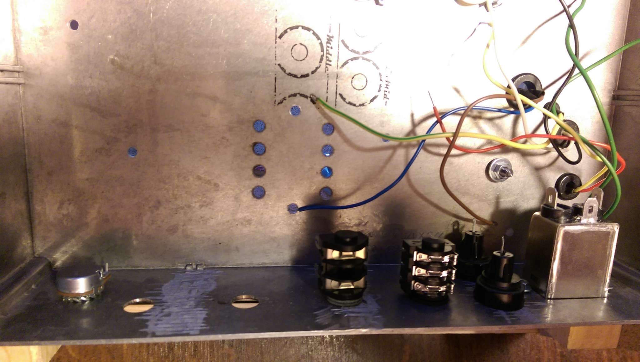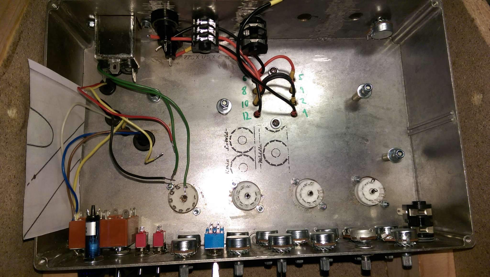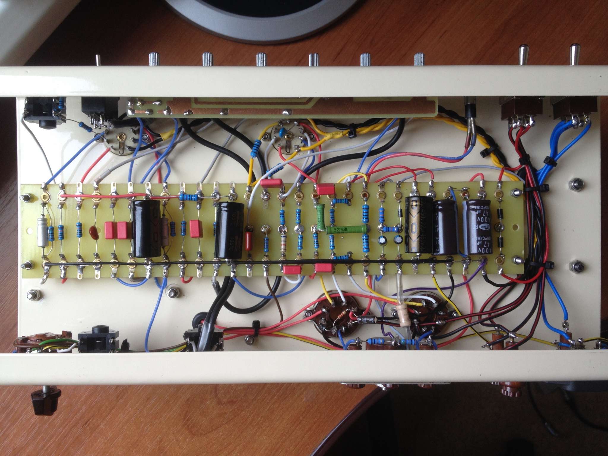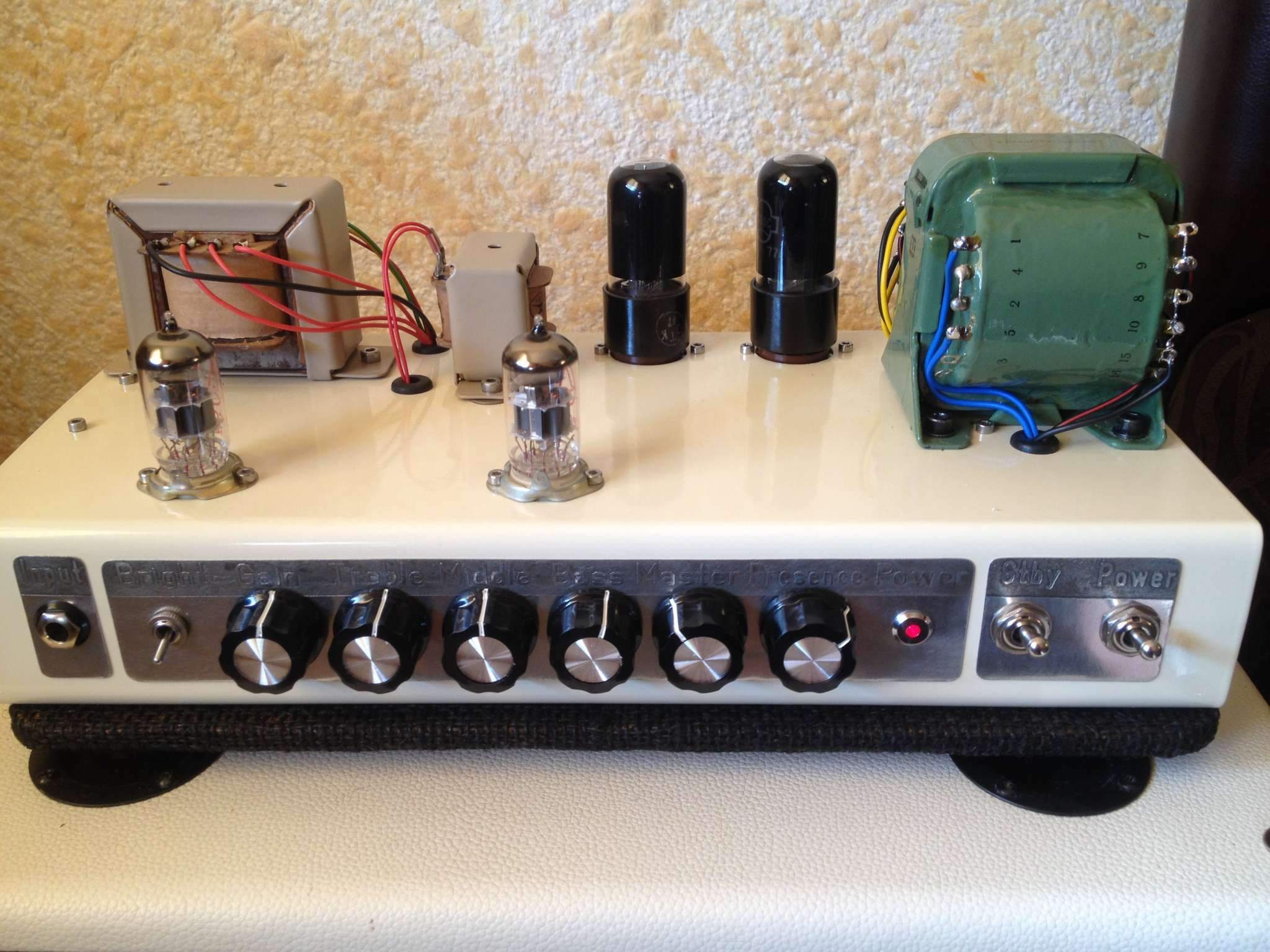 А я вот сегодня тоже доделал тёплый, ламповый, но не совсем домашний. Схема отличается только оконечным каскадом и хвостом фазика. Буду одомашнивать.) Осталось для него будку построить. Хорошо по своему звучит. В отличии от трехкаскадного твина от Тандера, этот как бы более стерильный, без особого окраса звучания вышел. С педальками дружит на ура, с преампами еще не пробовал, (кстати, отличный повод начать собирать преампы) Хоть в подвале шасси немного "вермишелево", фона нет абсолютно, только тихое шипение.
